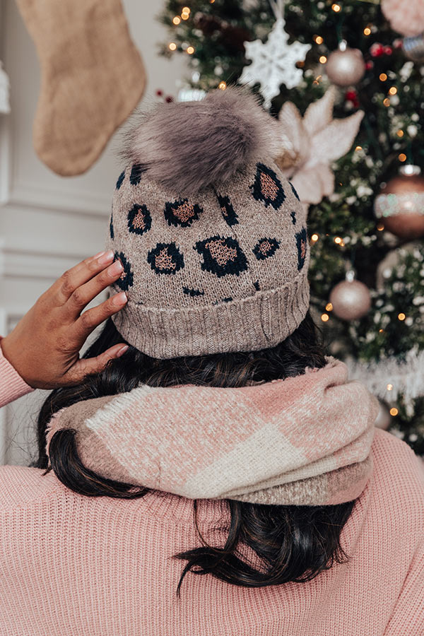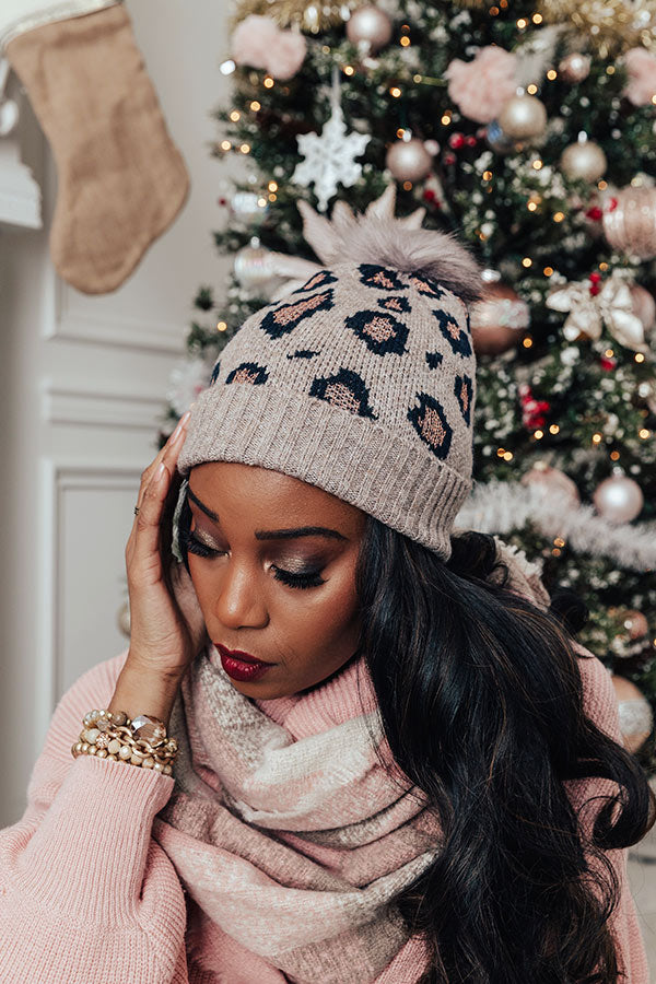 Stay warm and protected from those chilly winter flurries with this adorable beanie featuring lightweight tight knit material patterned with a taupe hued leopard print, a rolled silhouette, and a faux fur pom accent!