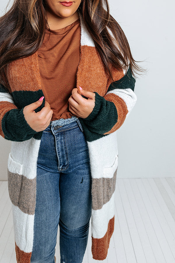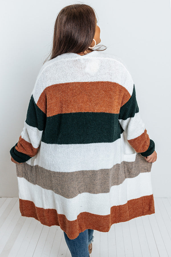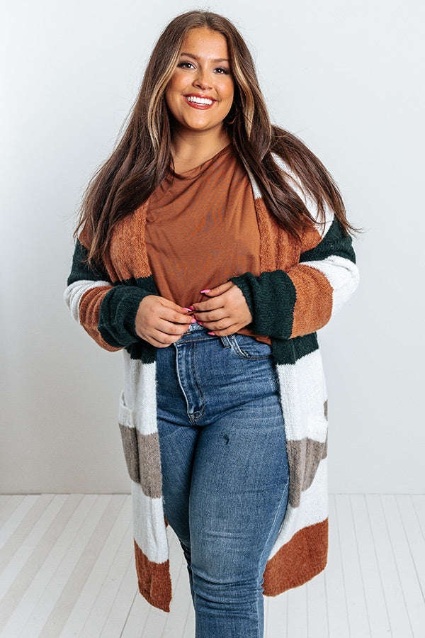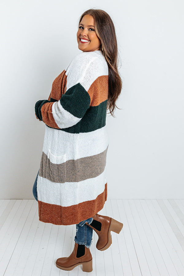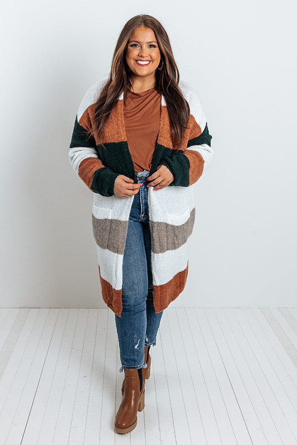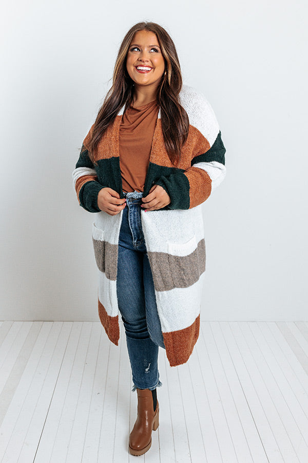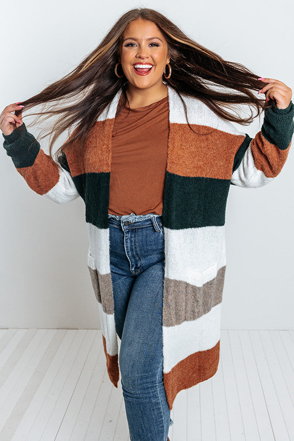 Stay warm and protected from all those chilly winter flurries by layering up with this charming plus size cardigan featuring soft lightweight tight knit material with wide horizontal fall hued accent stripes, long loose sleeves, accent side pockets, and an ultra draped open front silhouette that cascades into a straight knee-length hemline!