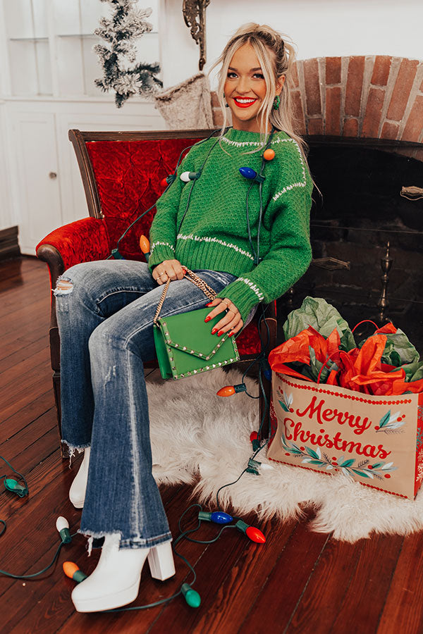 Be vibrant this holiday season with our green 'Flurry Factor' sweater featuring soft and thick knit material with white accent stitching, a rounded neckline, long loose sleeves, and a slouched silhouette that falls into a straight cropped hemline! Measurements