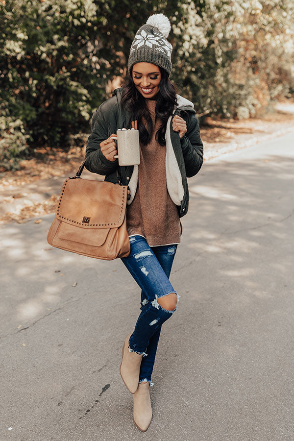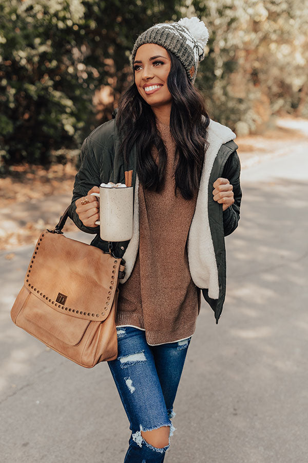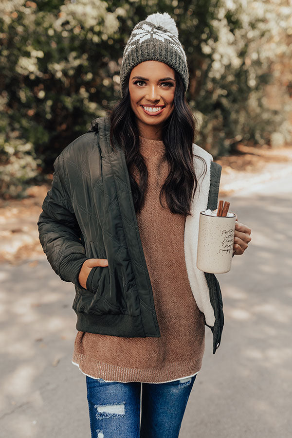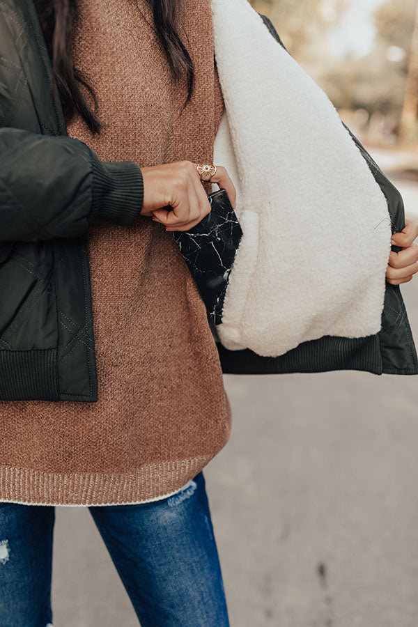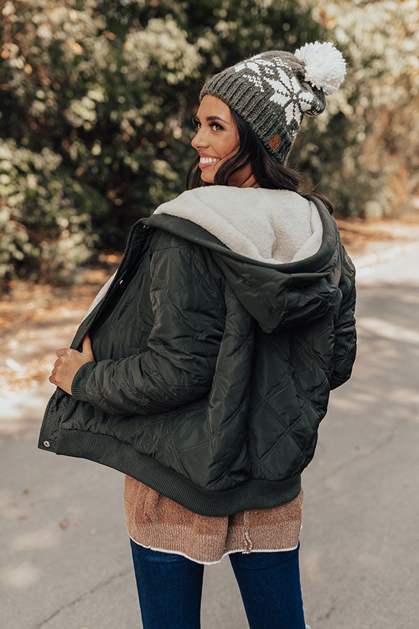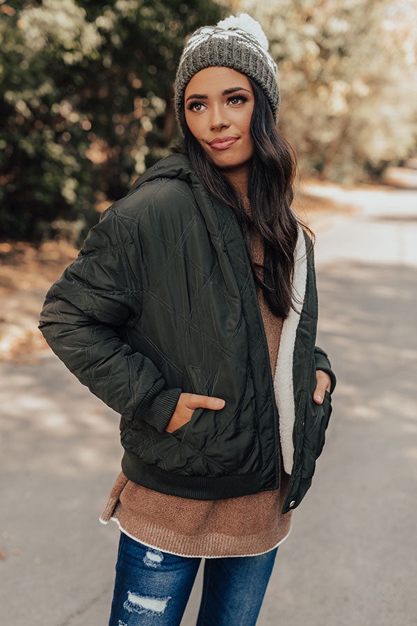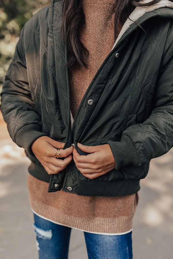 There is no better piece to throw on and go when you are in a rush than this adorable army green hued jacket featuring sleek lightweight quilted material with ultra soft sherpa lining, long loose sleeves with fitted cuffs, a snap button closure front with a hooded back, low accent side pockets, and a bomber silhouette that ends in a straight hemline!
