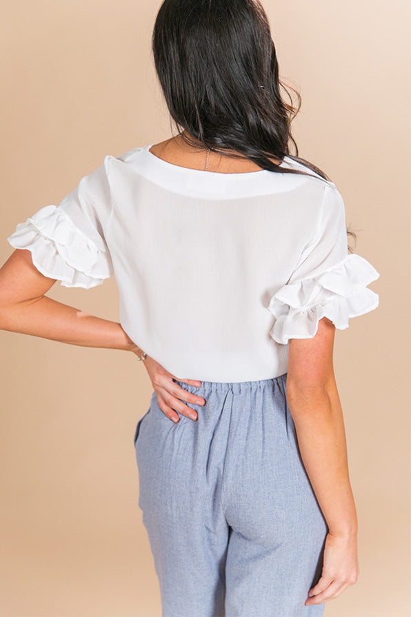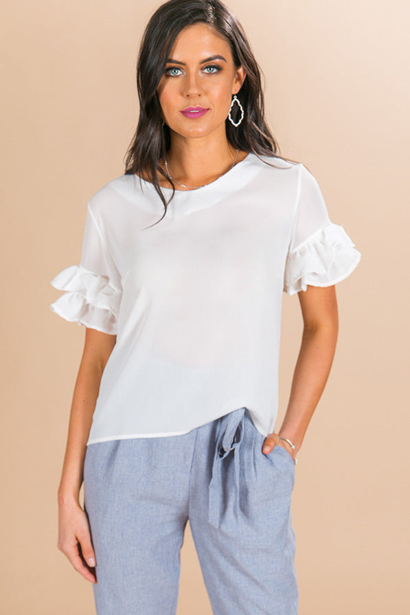 Keep it classy in the "Flying First Class Shift Top!" This chic chiffon top has a scooped neckline, relaxed semi-sheer bodice & sassy ruffled sleeves that can take you from 9 to wine!