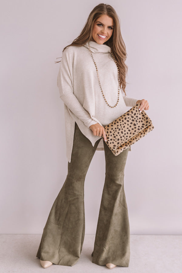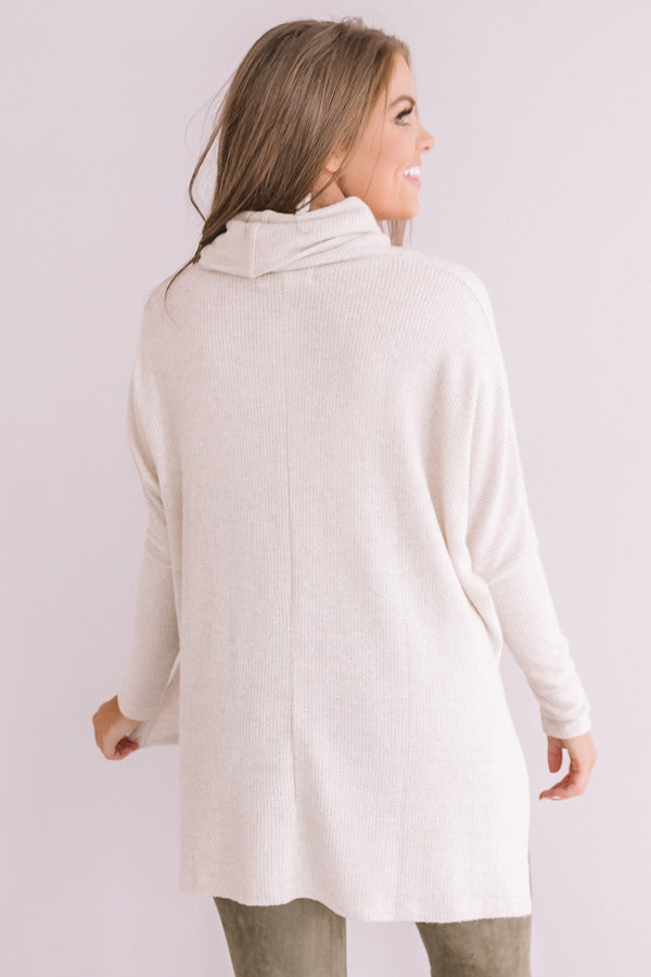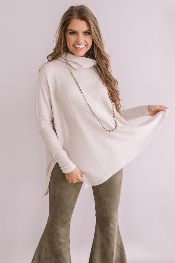 Welcome the winter season in style with our birch colored "Flying Private Shift Tunic" featuring soft lightweight material with subtle waffle knit texturing, a high rolled turtle neckline, long batwing sleeves with fitted forearm cuffs, and an ultra relaxed silhouette that falls into a straight high/low hemline with high side slits! We have styled this transitional cutie with some green velvet flares, neutral booties, and a cheetah print clutch, but you can also wear it with some distressed ankle skinnies, "The Seraphina Faux Leather Wedge in Taupe," and "The Waverly Hat in Olive!" Measurements