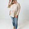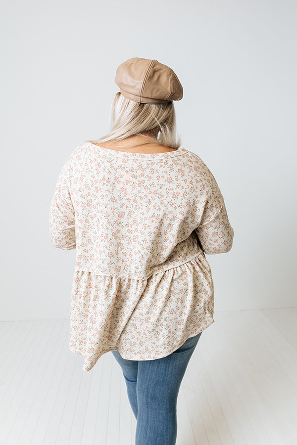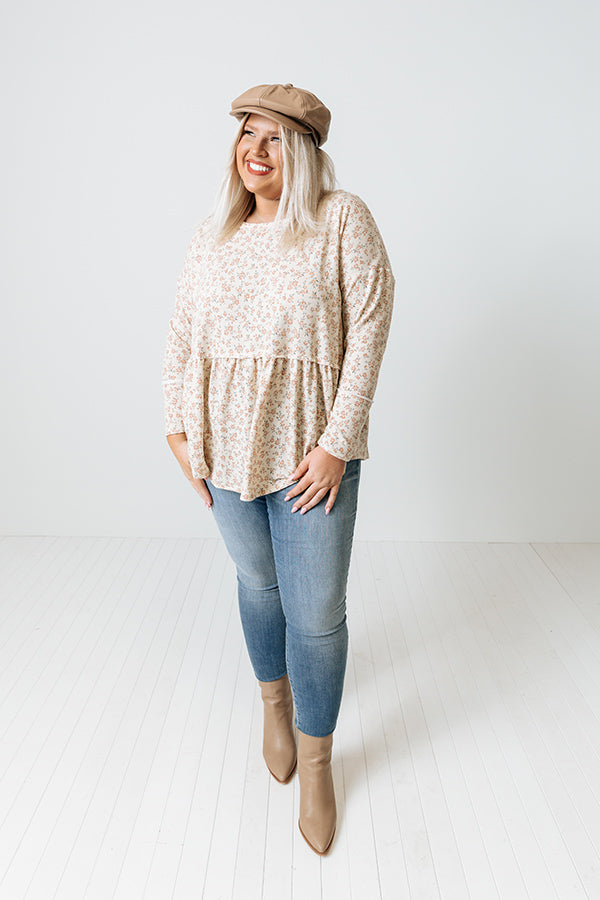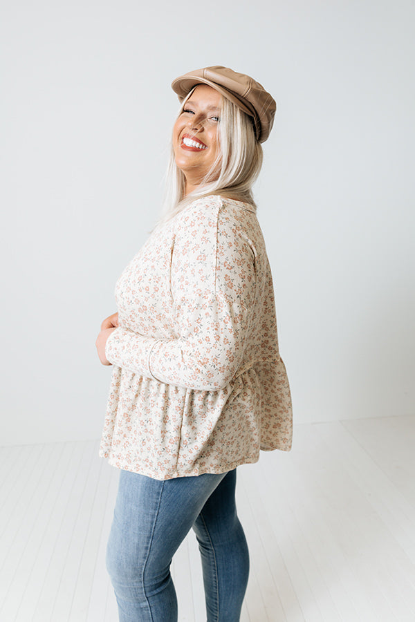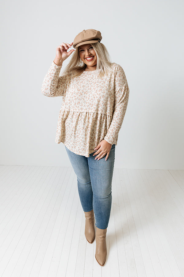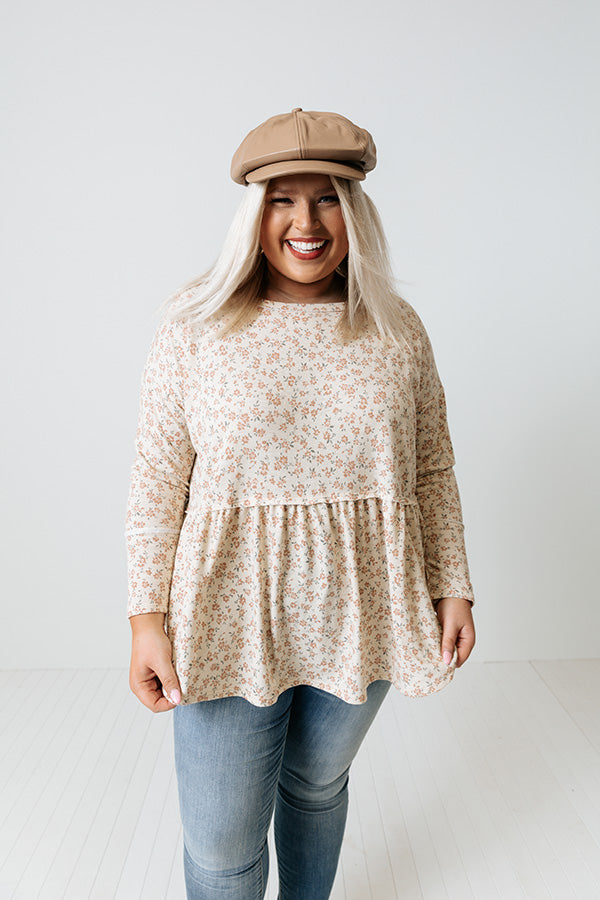 Let your fall style blossom in our darling plus size cream hued 'Focus On Friendship' shift top featuring lightweight material patterned with a light blush hued floral print, a rounded neckline, long loose sleeves, and a relaxed silhouette that ends in a straight peplum hemline!