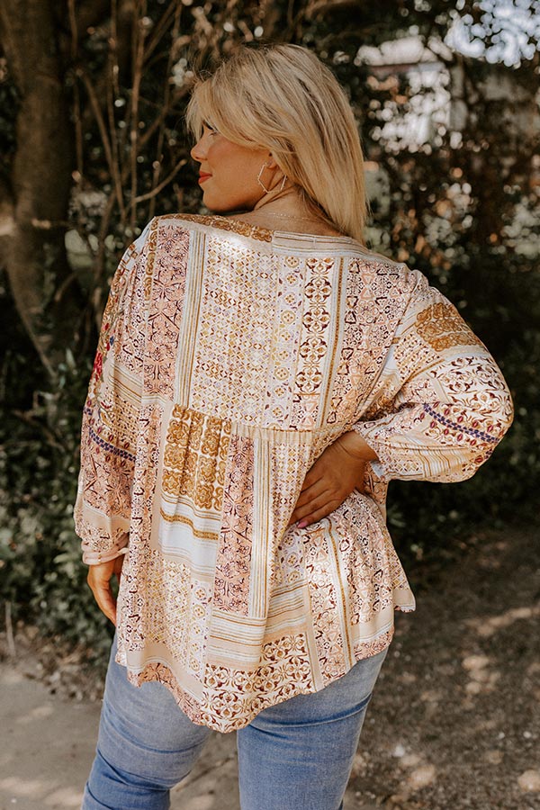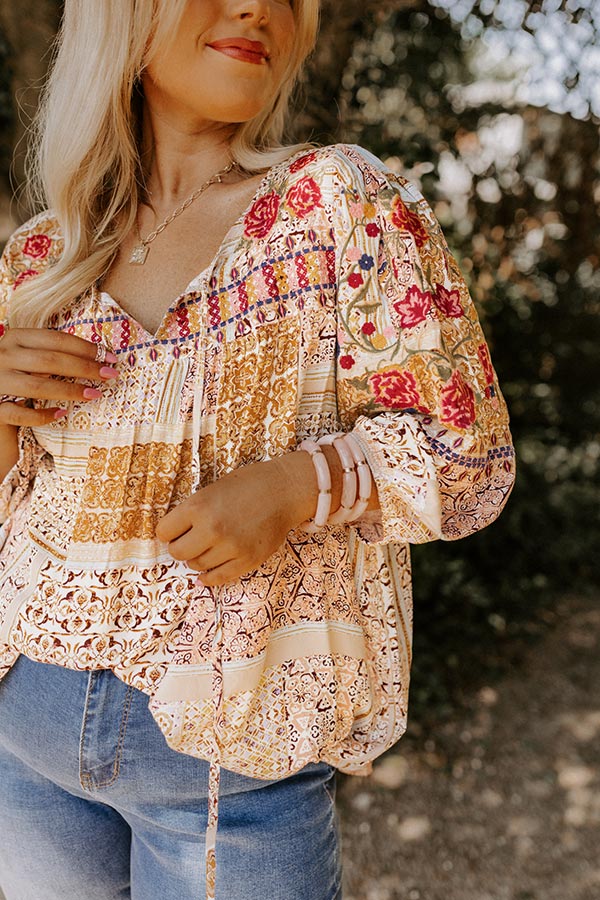 Plus Size - Slay all day in our charming 'Focus On Love' shift top featuring lightweight flowy material patterned with various intricate prints, a v-cut neckline with a tie closure, long bubble sleeves with elastic band cuffs, and a relaxed silhouette that falls into a rounded hemline!