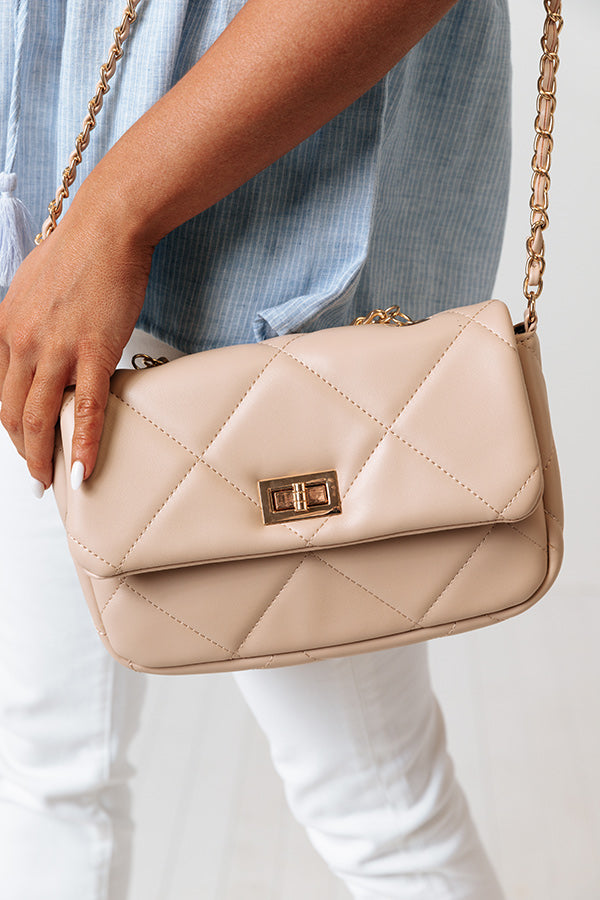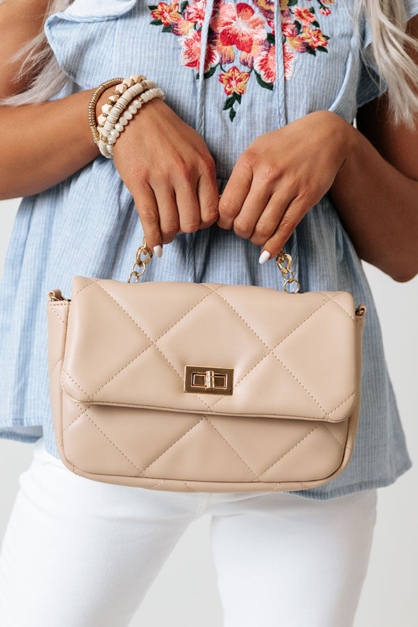 Complete your look with our luxe iced latte colored 'Focus On Love' crossbody featuring faux leather material with oversized checkered quilting, a flap closure with gold twist hardware, a short chain handle and a longer chain strap, and a spacious fully lined rectangular pouch with an additional inside pocket!