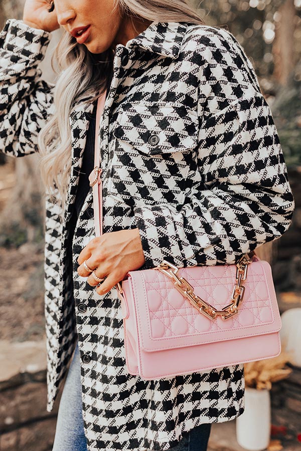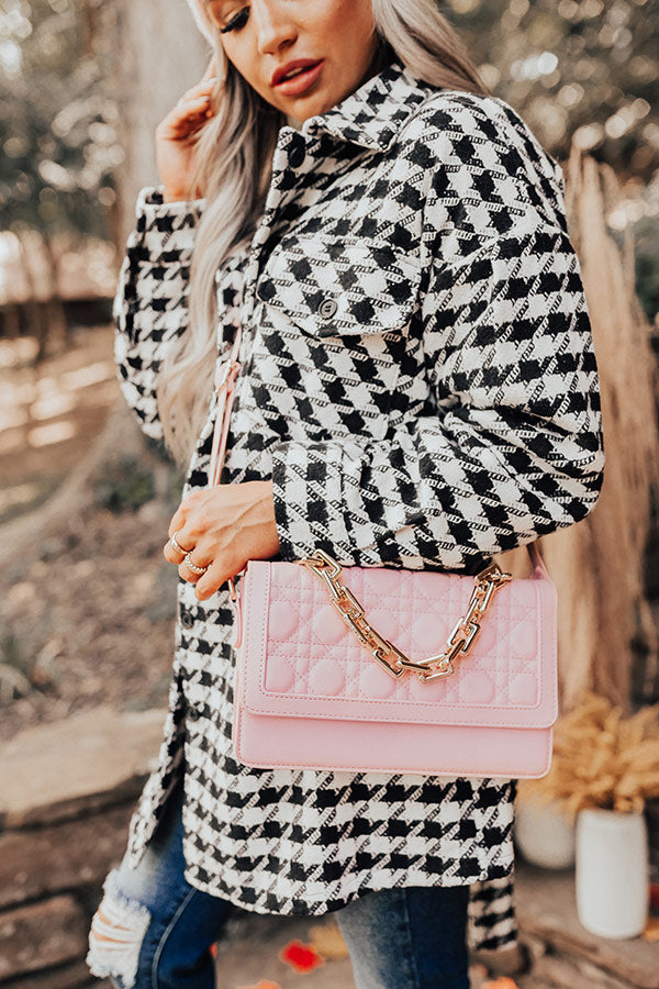 Designer inspired, our high end blush colored 'Focus On The Future' crossbody featuring sleek faux leather material, a flap closure with quilted texturing and a snap button, a gold chain tote handle, an adjustable shoulder strap, and a spacious fully lined interior with an additional inside pouch!