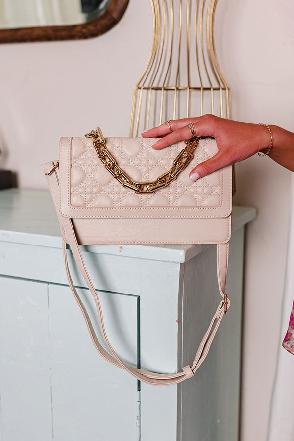 Designer inspired, our high end light birch colored 'Focus On The Future' crossbody featuring sleek faux leather material, a flap closure with quilted texturing and a snap button, a gold chain tote handle, an adjustable shoulder strap, and a spacious fully lined interior with an additional inside pouch!