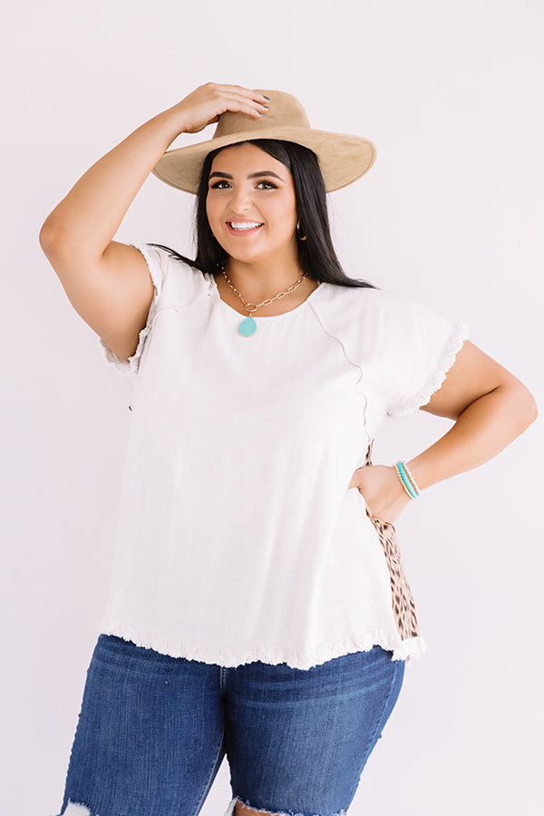 Plus Size - Nothing says business in the front and party in the back like our unique stone colored "Follow Along Shift Top" featuring soft lightweight material, a brown back patterned with a bold leopard print, a high rounded neckline, short loose sleeves, frayed trim detailing, and a relaxed silhouette that falls into a rounded hemline!