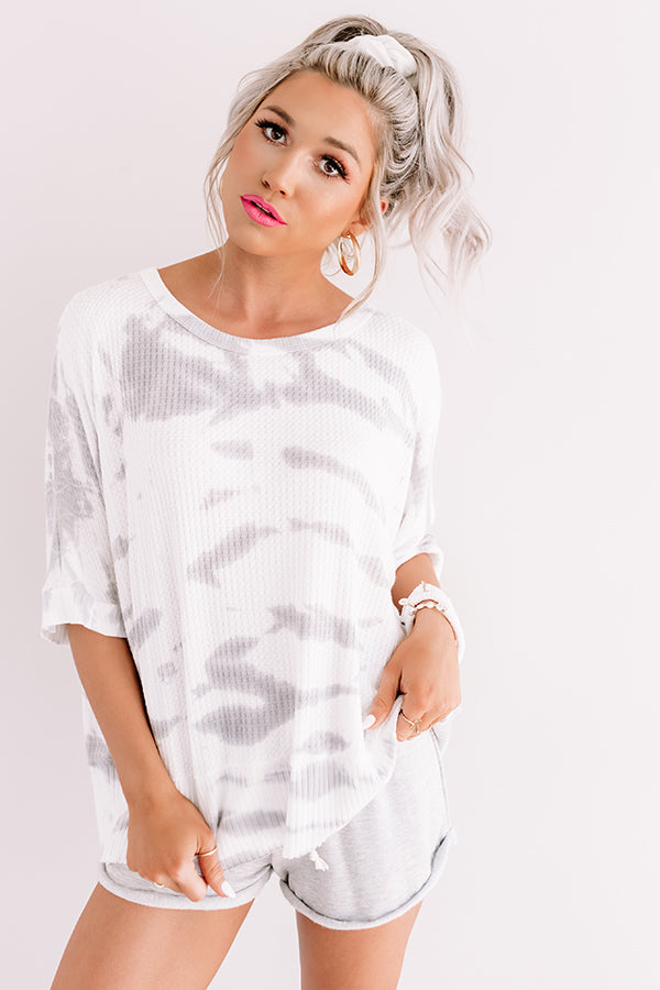 Follow your amazing style sense and add this adorable top to your cart with its soft lightweight material, waffle knit texturing, grey tie dye pattern, wide rounded neckline, short loose half sleeves, deep v-cutout back with a twisted detail, and relaxed silhouette that falls into a rounded hemline! We have styled this unique piece with some matching grey shorts and a white scrunchie, but you can also wear it with some distressed ankle skinnies, "The Brighton Espadrille in Grey," and our "Blissful Bay Woven Tote!" Measurements
