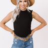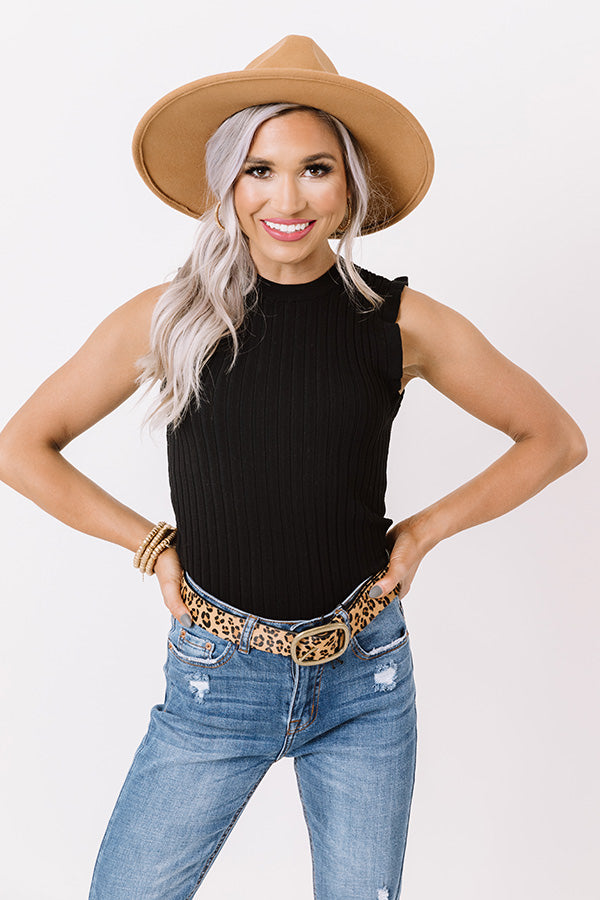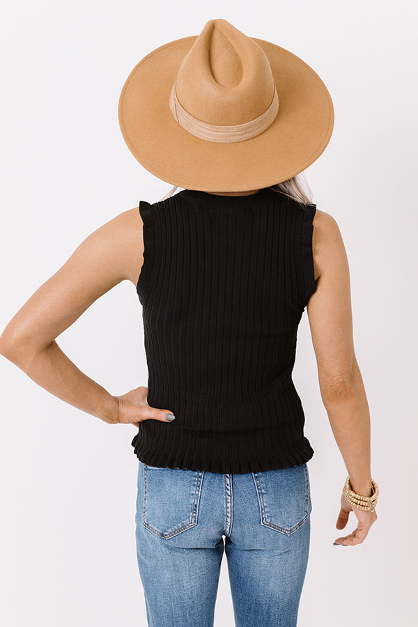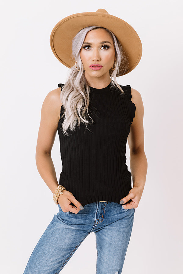 Follow your stylish heart and add this black cutie to your cart! Our darling "Follow Your Heart" top features soft lightweight stretchy material with vertical ribbed texturing, a high rounded neckline, wide 3-inch sleeveless shoulders, ruffled trim detailing, and a flattering form fitting silhouette that falls into a straight hemline!