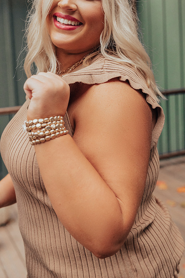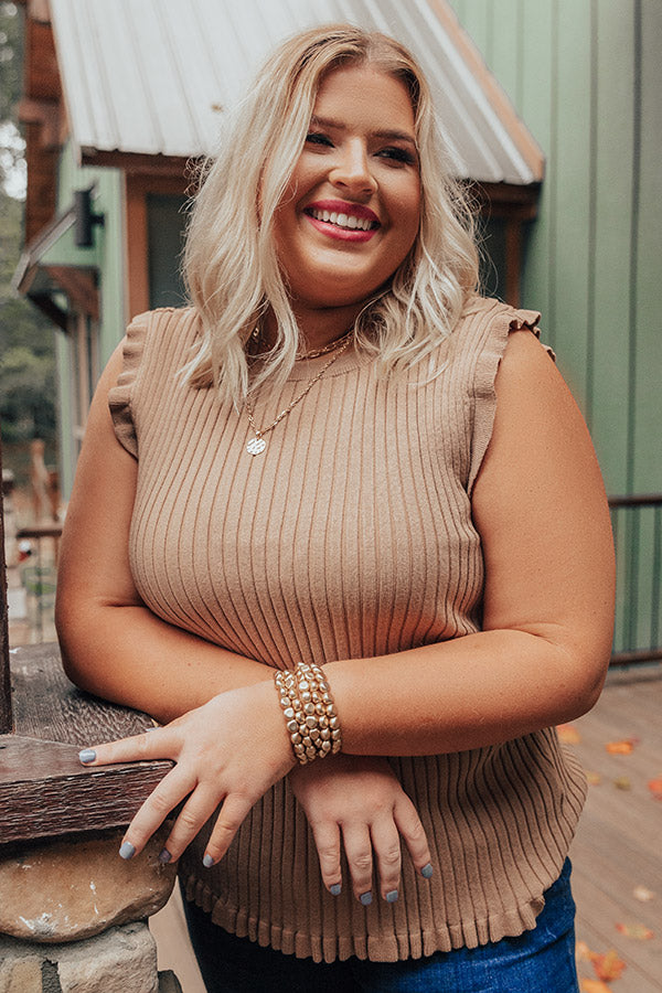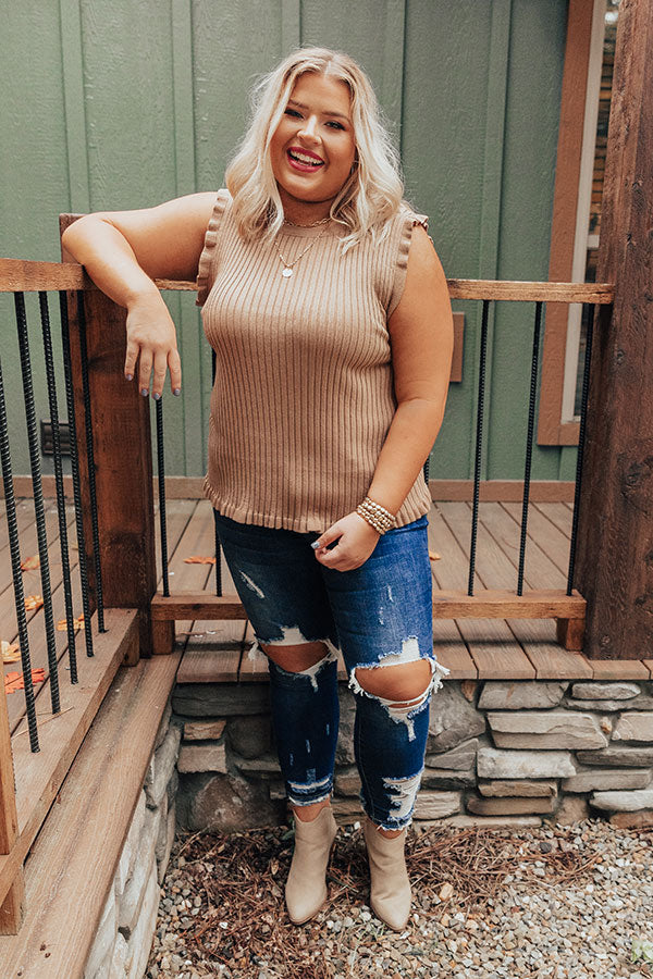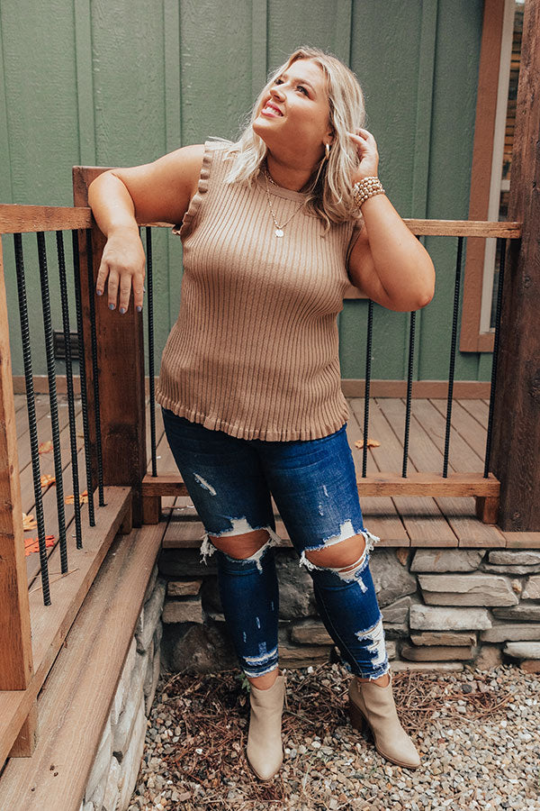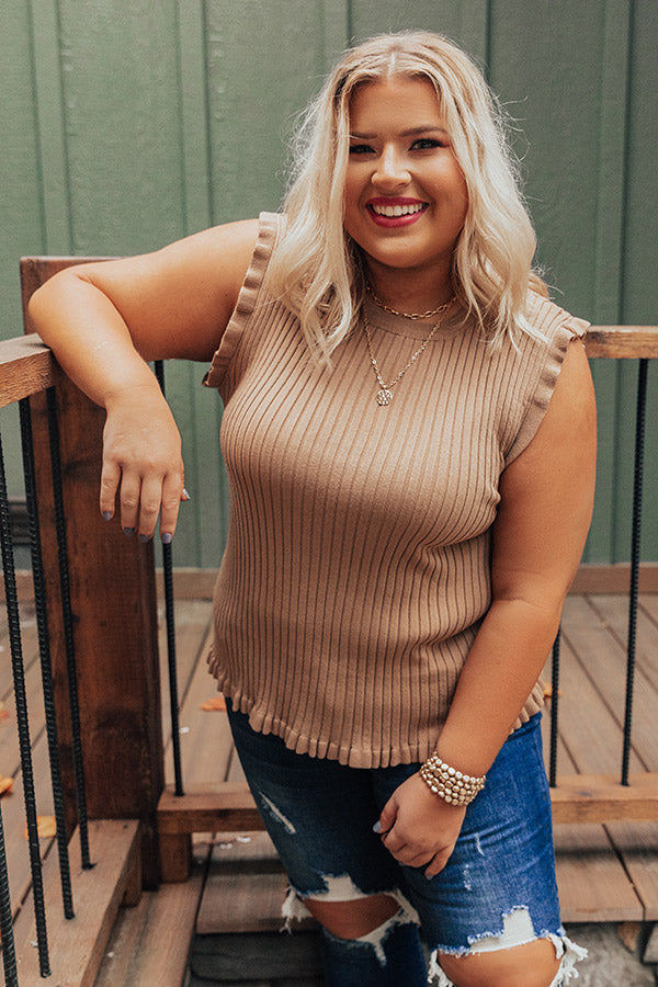 Plus Size - Follow your stylish heart and add this khaki colored cutie to your cart! Our darling "Follow Your Heart" top features soft lightweight stretchy material with vertical ribbed texturing, a high rounded neckline, wide 3-inch sleeveless shoulders, ruffled trim detailing, and a flattering form fitting silhouette that falls into a straight hemline! Measurements