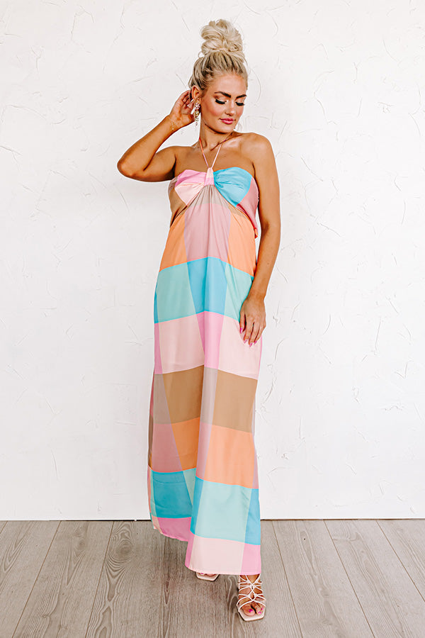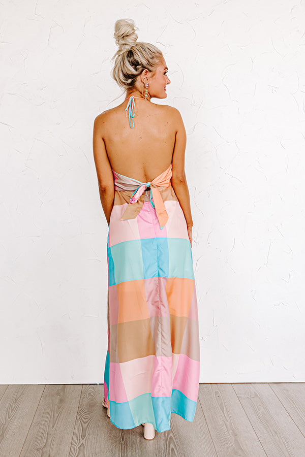 Follow your happiness and add this chic maxi dress to your cart with its sleek lightweight material patterned with orange, link, blue, and brown hued color block squares, a flattering bodice with a tie back closure, a sweetheart neckline with a halter tie, and a flattering silhouette that ends in a straight ankle-length hemline! on products