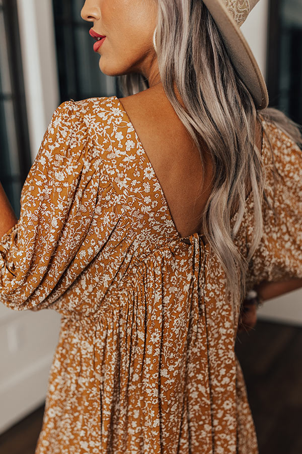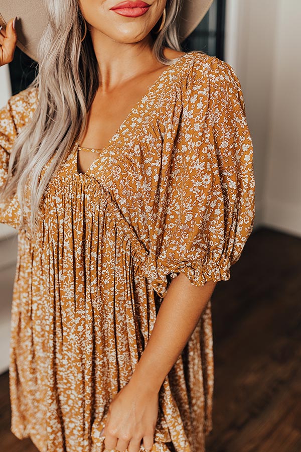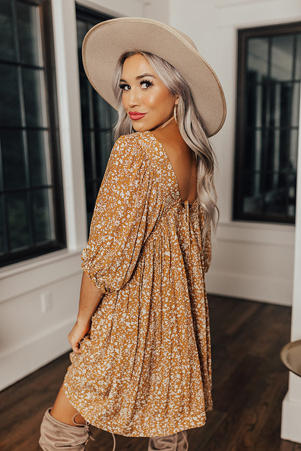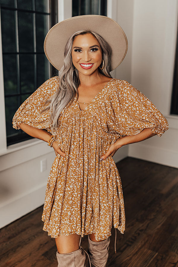 People are sure to follow your fashion lead when you wear this beautiful mustard colored dress featuring lightweight flowy material patterned with a small white spotted print, a v-cut neckline and upper back with a tie closure, oversized bubble sleeves with elastic band cuffs, and a flattering silhouette that falls into an uneven mid-thigh length hemline! Measurements
