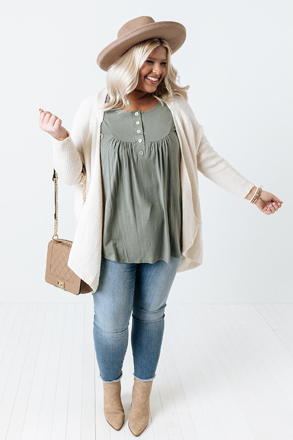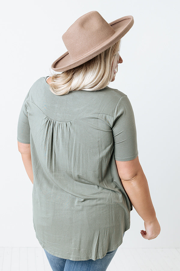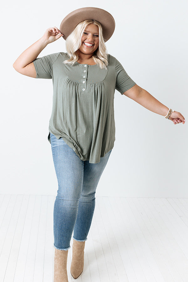 People are sure to follow your style lead when you complete your look with this versatile light sage colored plus size shift top featuring lightweight material, a button up bodice with a rounded neckline, short sleeves, and a relaxed silhouette that falls into a rounded hemline! Measurements