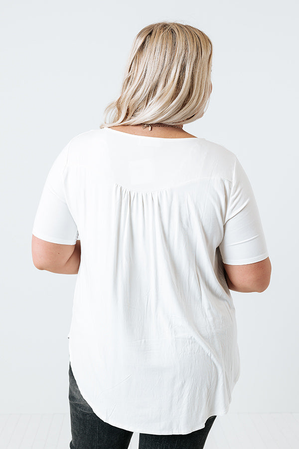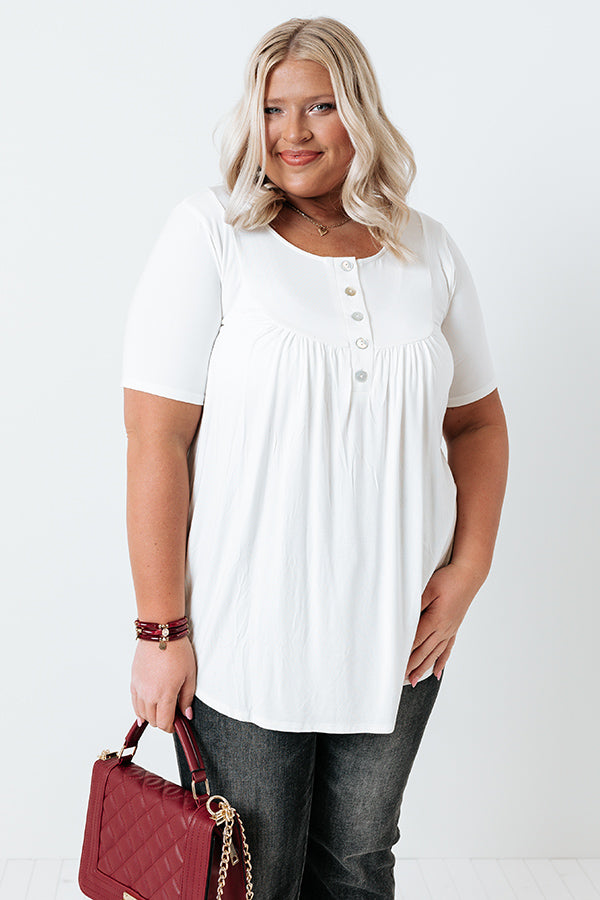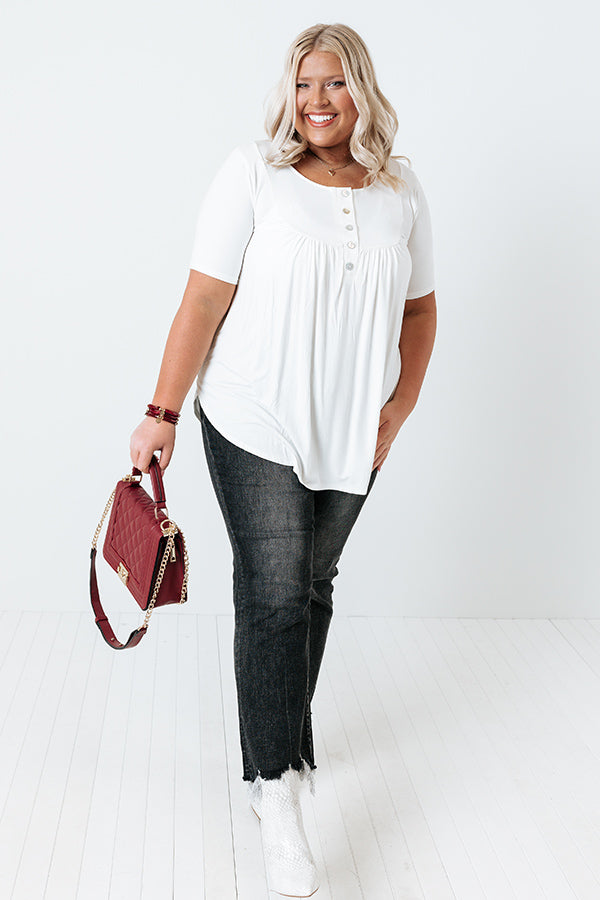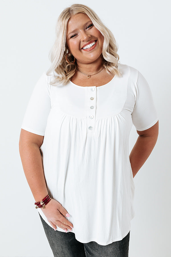 People are sure to follow your style lead when you complete your look with this versatile white plus size shift top featuring lightweight material, a button up bodice with a rounded neckline, short sleeves, and a relaxed silhouette that falls into a rounded hemline! Measurements