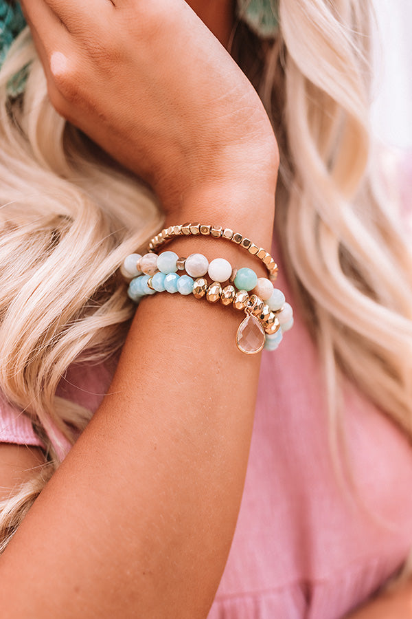 Follow your fashion loving heart and add this cute bracelet set to your cart with its three gold and aqua colored beaded stretch pieces!