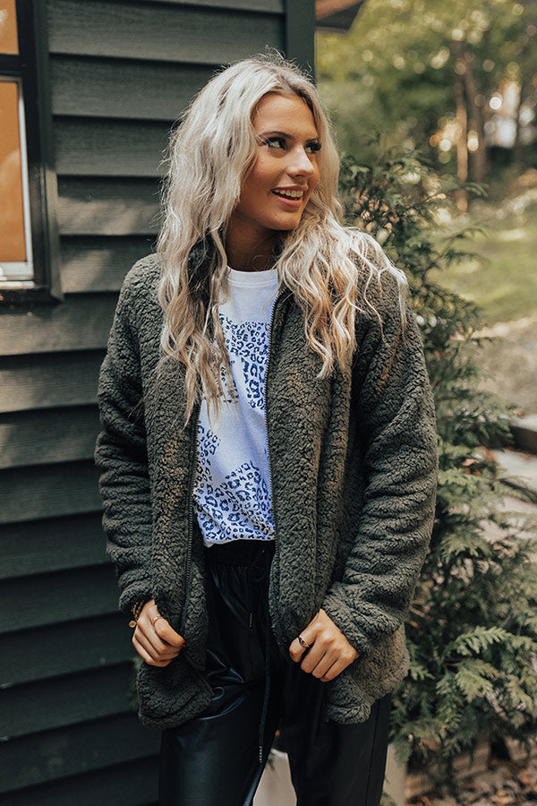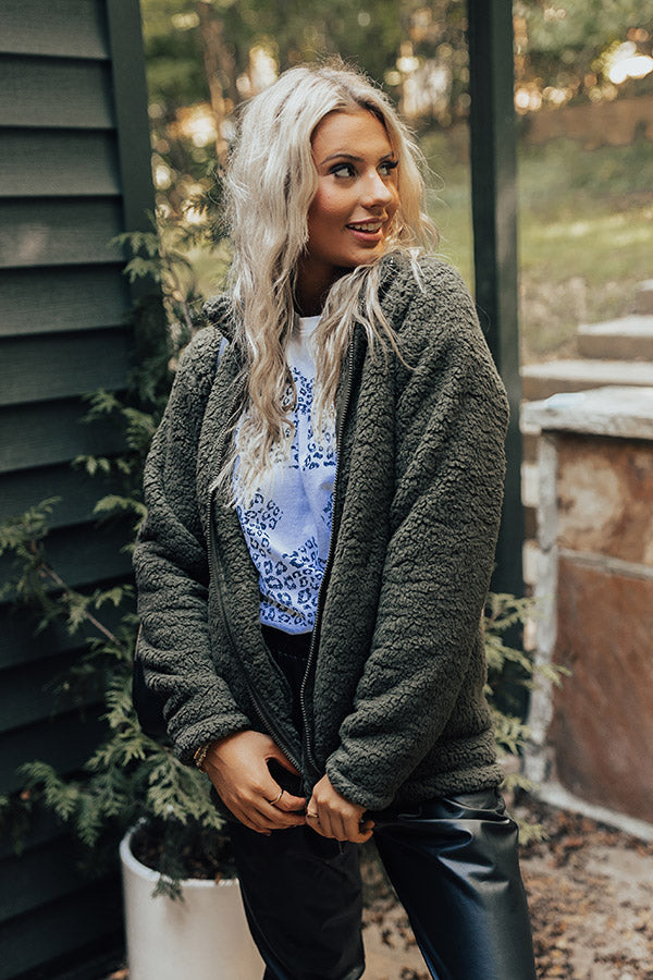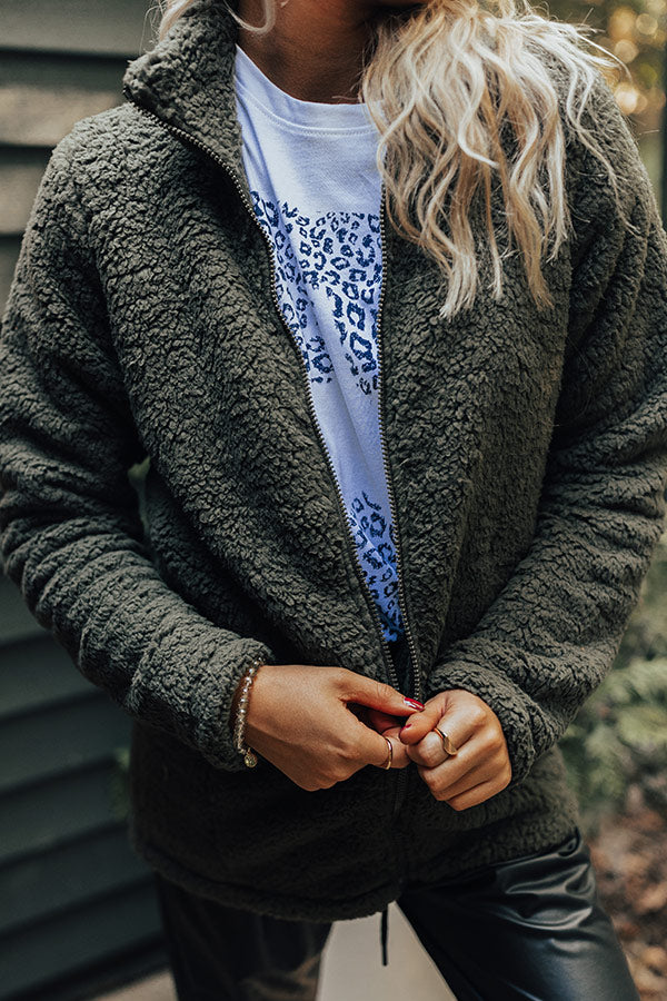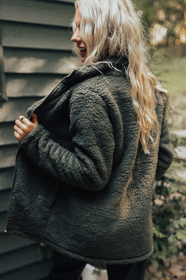 You are sure to have fond memories when you wear this cozy olive colored jacket featuring ultra soft sherpa material, long loose sleeves, a zip closure front with a collared neckline, accent side pockets, and a relaxed silhouette that ends in a straight hemline!