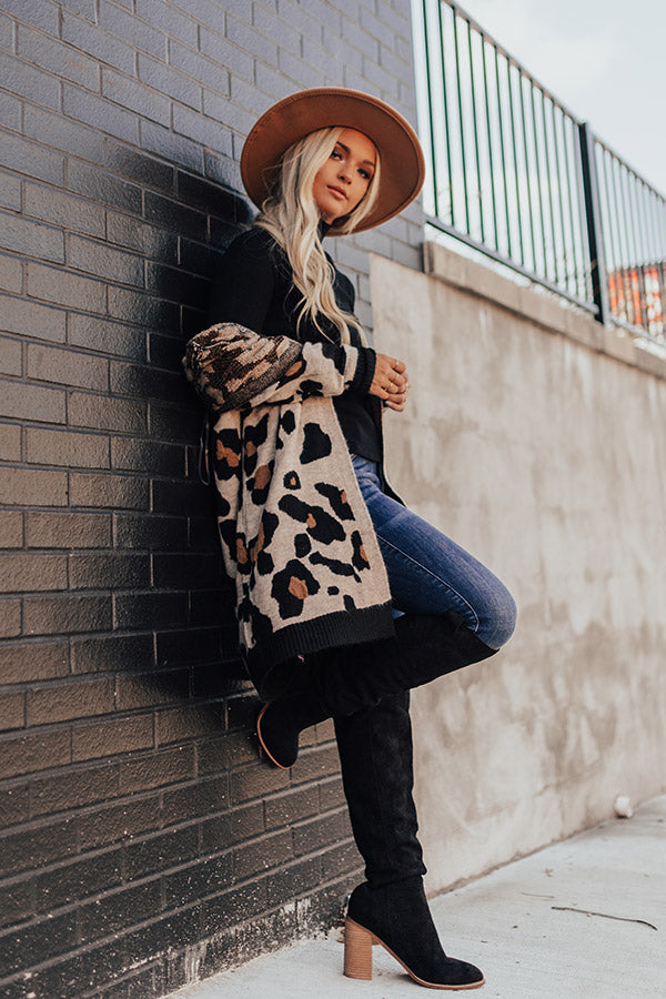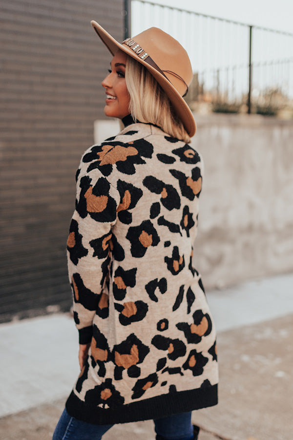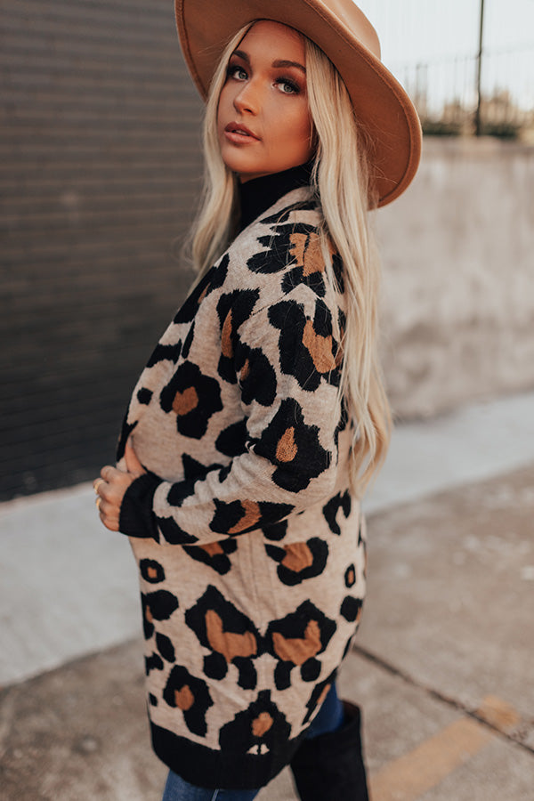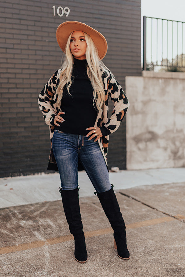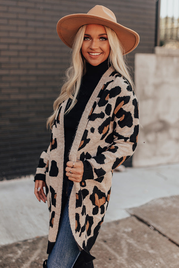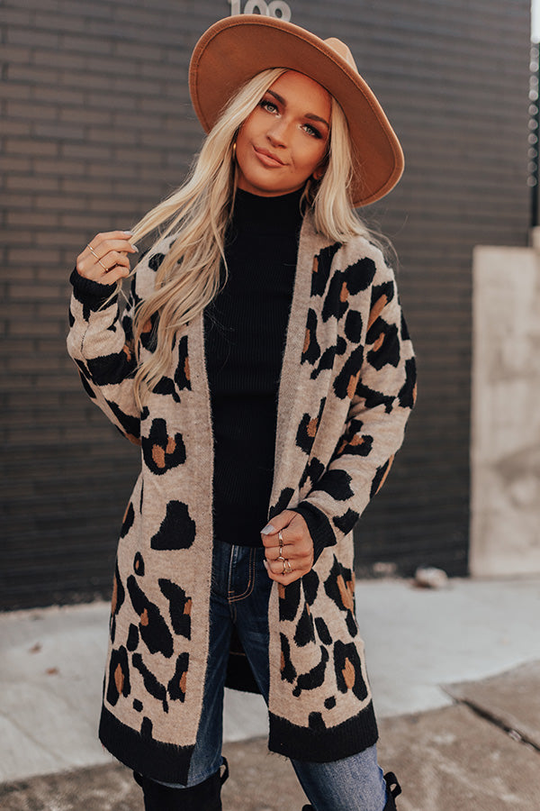 We have no doubt you will be fond of this stunning neutral hued cardigan featuring ultra soft and warm tight knit material patterned with a large black and camel colored leopard print, long loose sleeves with fitted cuffs, and an ultra draped open front silhouette that cascades into a straight mid-thigh length hemline! Measurements