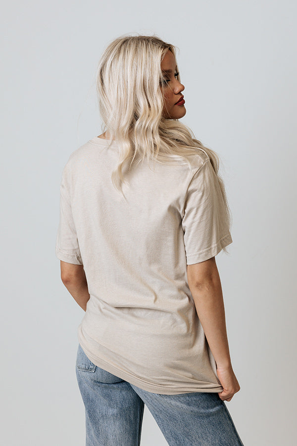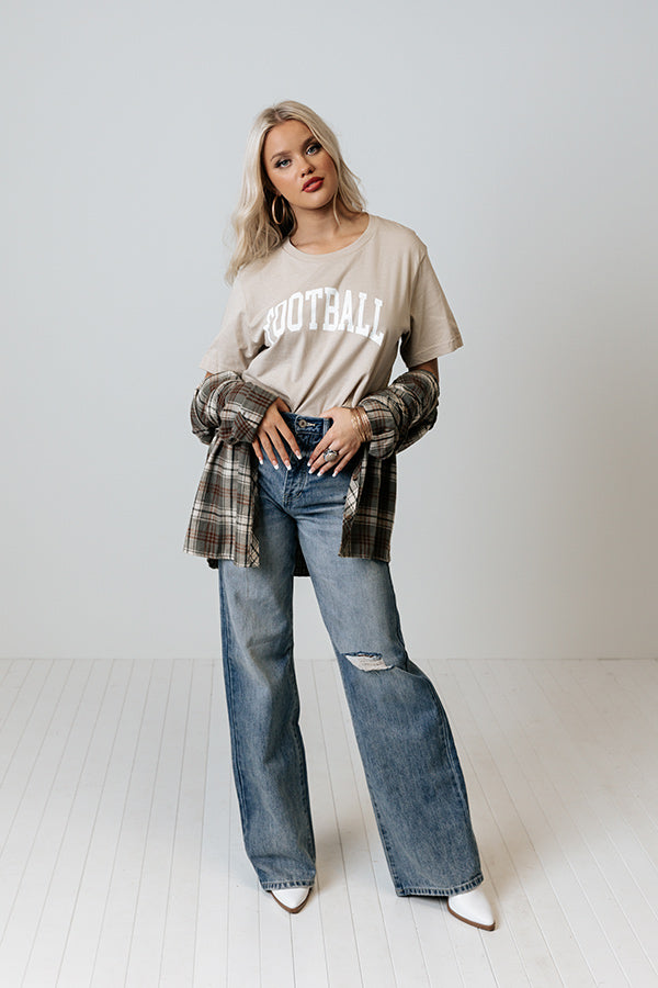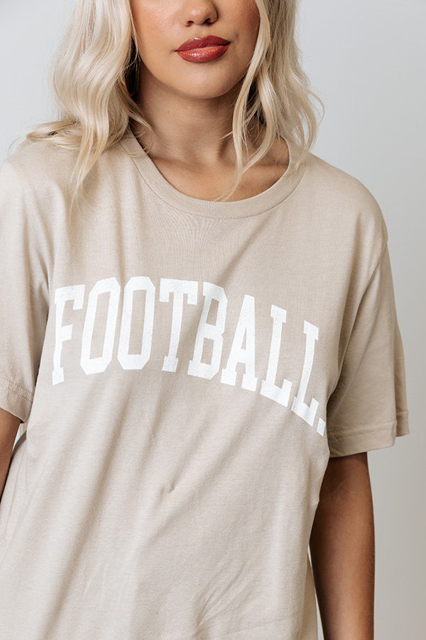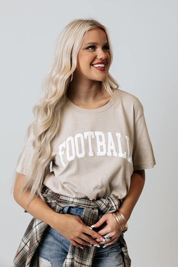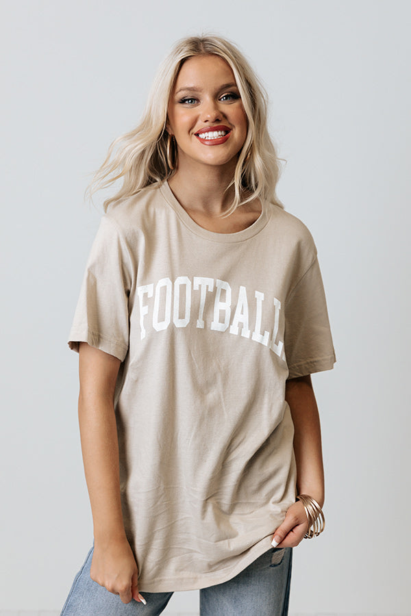 Cheer on your fave team in style with this adorable birch colored football tee featuring soft lightweight material with cute white block lettering on the front, a rounded neckline, short sleeves, and a relaxed silhouette that ends in a straight hemline! Measurements