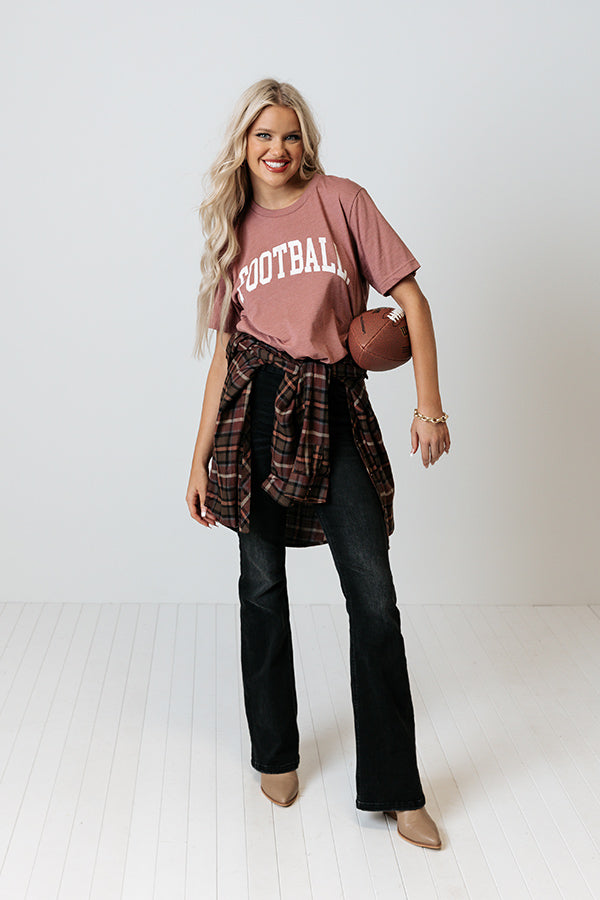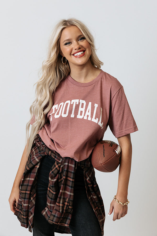 Cheer on your fave team in style with this adorable blush colored football tee featuring soft lightweight material with cute white block lettering on the front, a rounded neckline, short sleeves, and a relaxed silhouette that ends in a straight hemline! Measurements