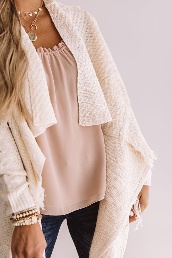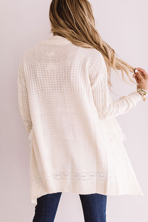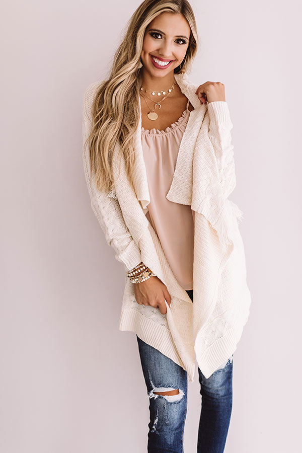 You will be obsessed with this ivory cardigan "for now and forever" with its soft tight knit material with abstract patterns, a jagged flap open front with fringe detailing, long fitted sleeves with fitted cuffs, and an uneven ribbed hemline! We have styled this piece over a basic tank with some distressed skinnies and a neutral peep toe bootie and tote, but you can also pair it with a simple taupe tee underneath tucked into our "Sweet Victory High Waist Corduroy Skirt in Wine," a faux suede hat, and "The Seraphina Faux Leather Wedge in Taupe!" Measurements