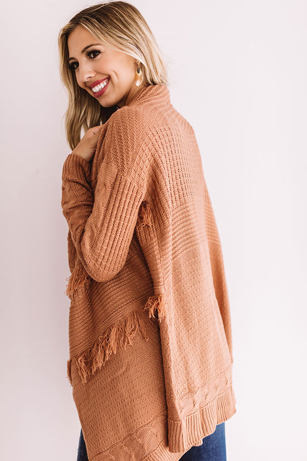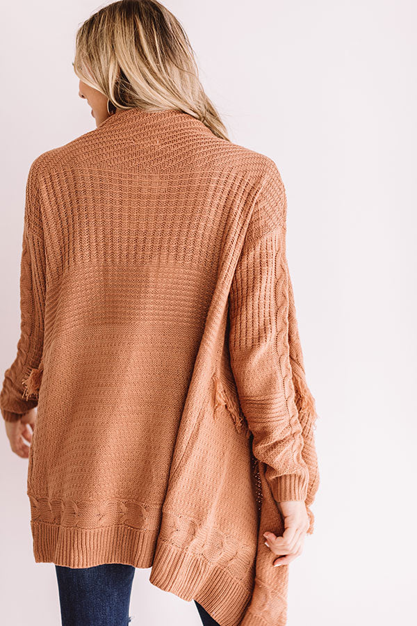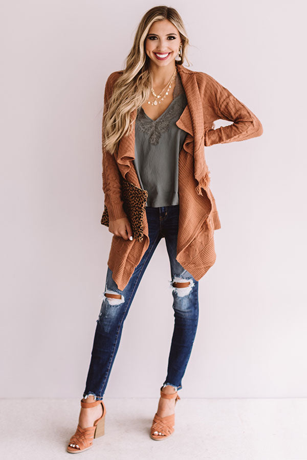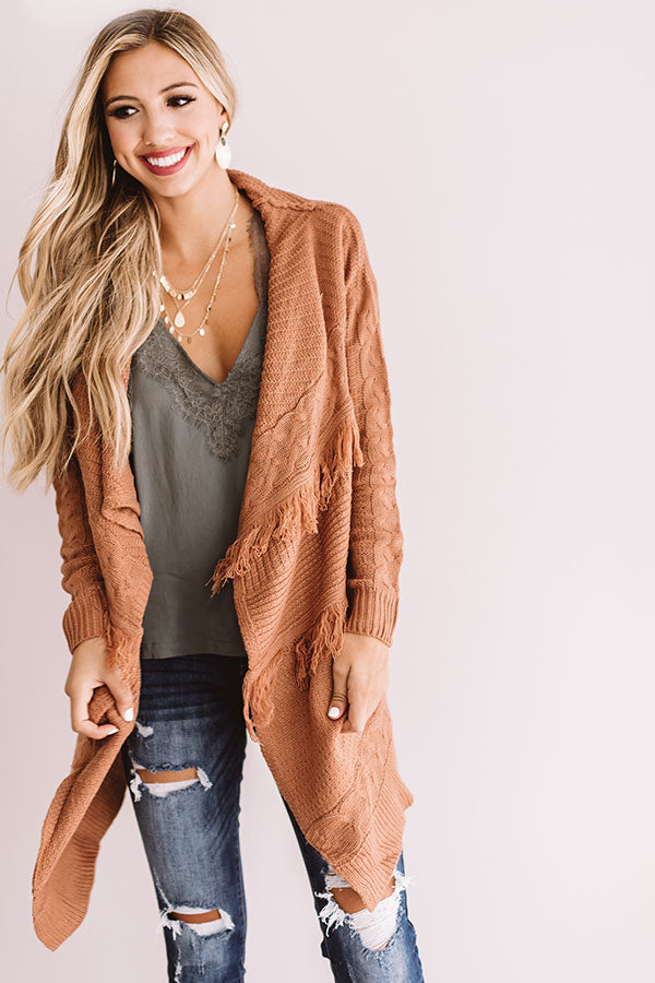 You will be obsessed with this rustic rose cardigan "for now and forever" with its soft tight knit material with abstract patterns, a jagged flap open front with fringe detailing, long fitted sleeves with fitted cuffs, and an uneven ribbed hemline! We have styled this piece over a basic tank with some distressed skinnies and a neutral cutout wedge, but you can also pair it with a simple taupe tee underneath tucked into our "Autumn Days High Waist Plaid Skirt in Birch," a faux suede hat, and "The Seraphina Faux Leather Wedge in Taupe!" Measurements