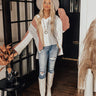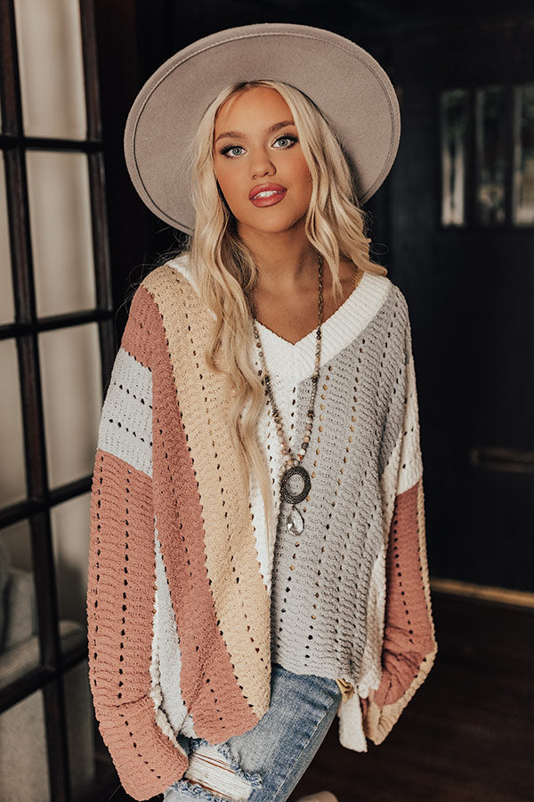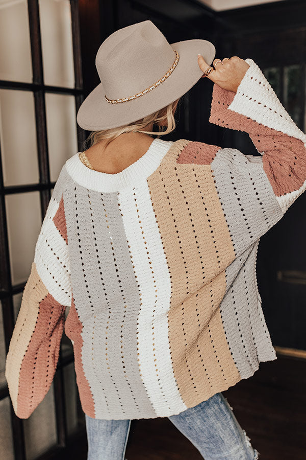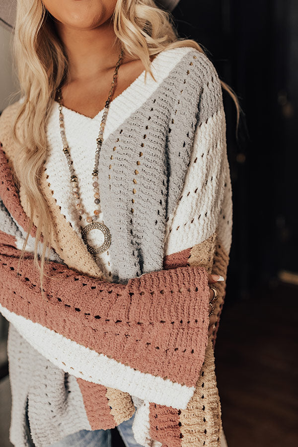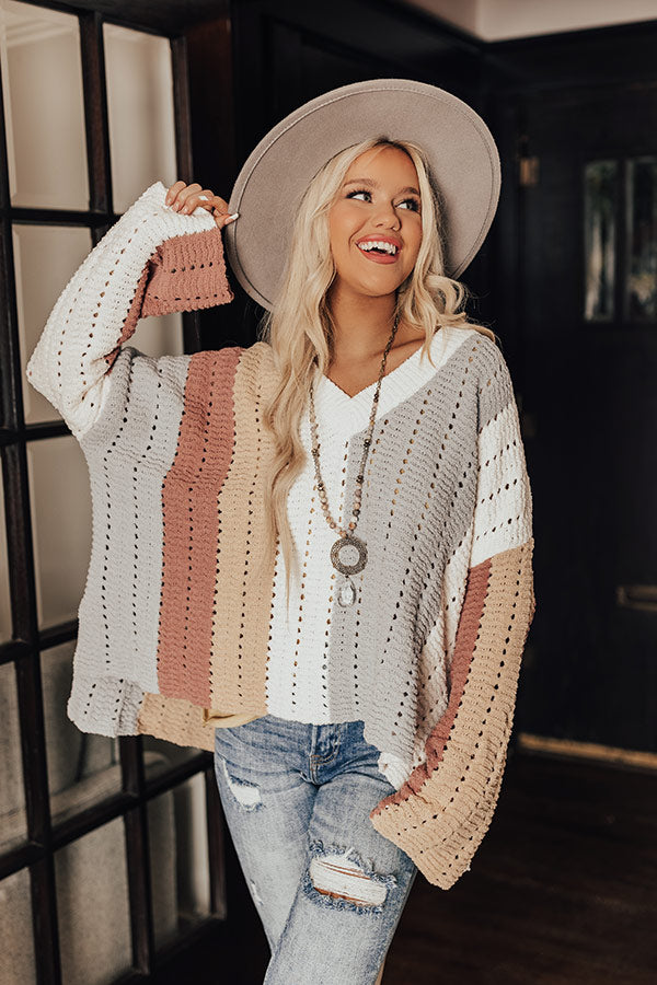 Arrive looking cozy in this adorable shift sweater featuring loose knit material with light rust, white, mustard, and grey hued accent stripes, a v-cut neckline, long oversized sleeves, and a slouched silhouette that falls into a straight hemline! Measurements