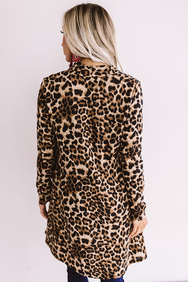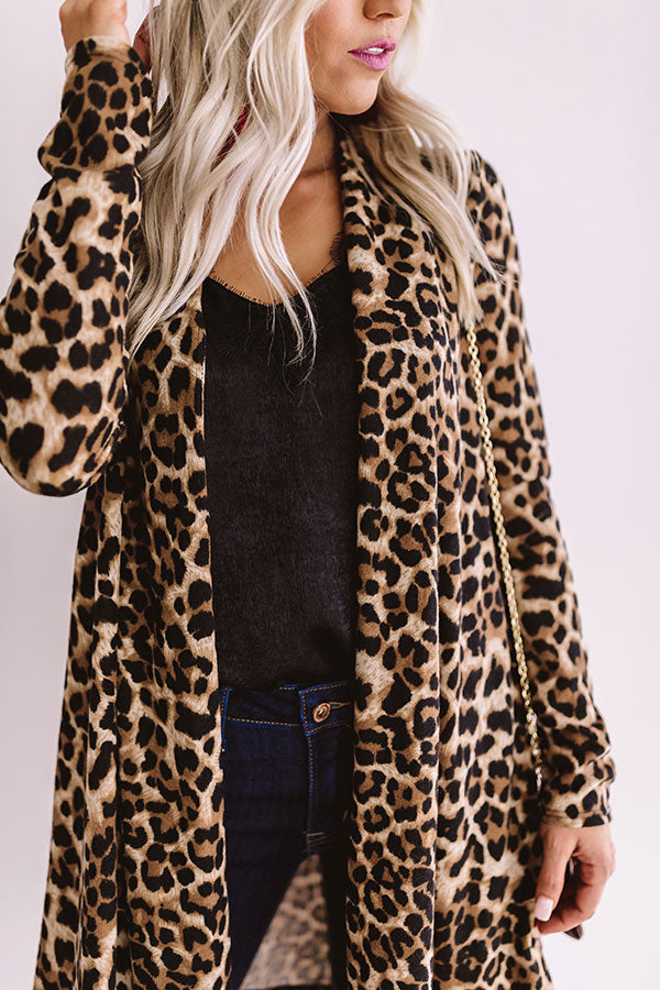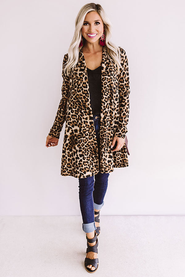 "For the love of leopard," treat yourself to this cardigan! It features long sleeves, lightweight tight knit stretchy material, and an open front with a straight upper-thigh length hemline! You can style this versatile piece with just about anything from a basic tank to a sweater, jeans to dresses, wedges to sandals, clutches to totes, and hats to earrings! Here we have styled it over a basic black tee with some cuffed skinnies and a strappy black heel! Measurements