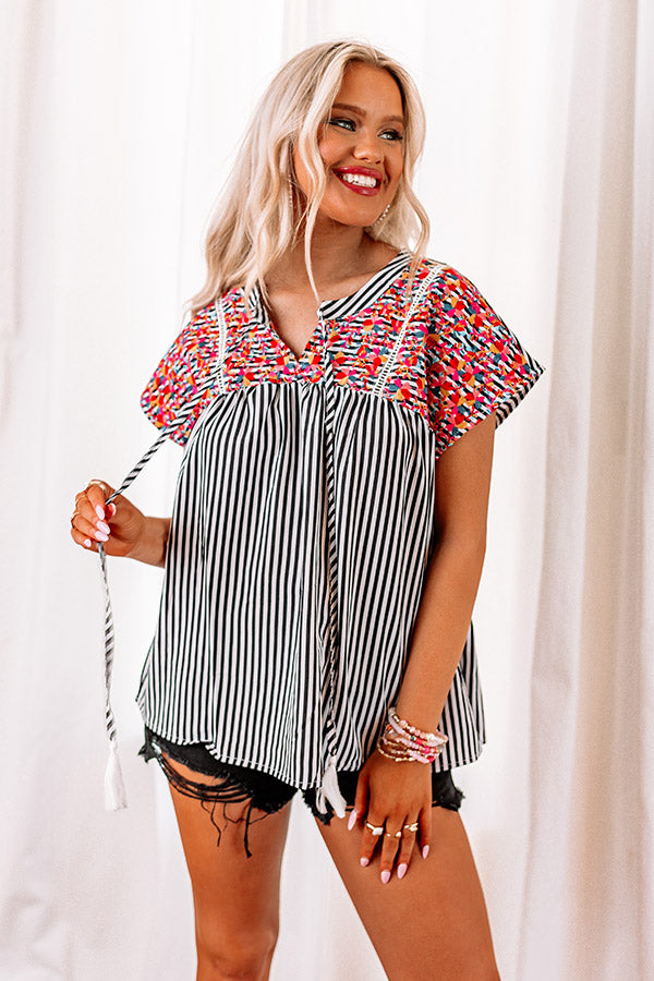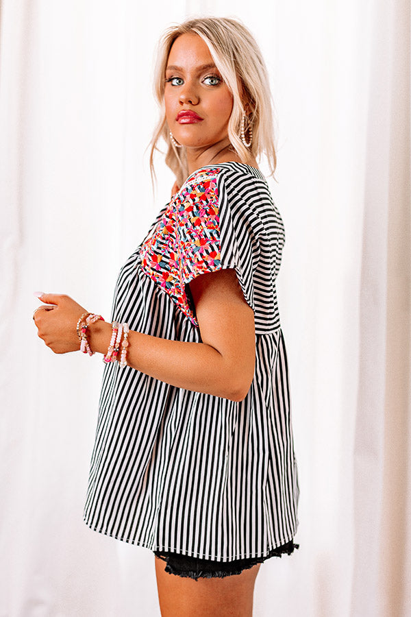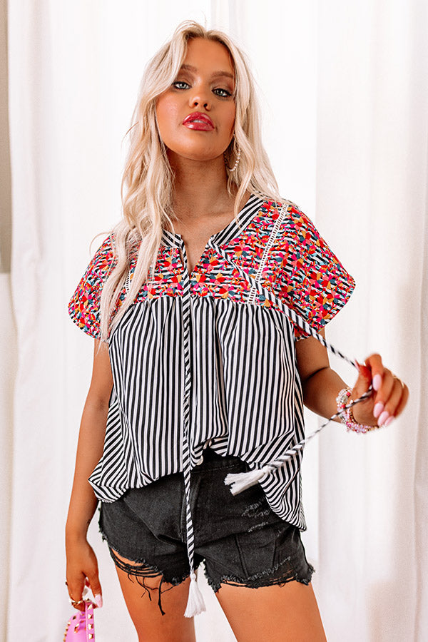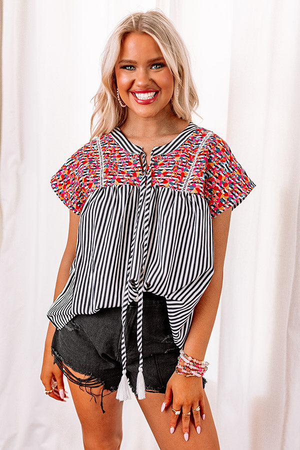 We have no doubt you will want to wear this charming top forever and ever with its lightweight black and white vertical striped material, hot pink and orange embroidered floral detailing, a v-cut neckline with a tie closure, short sleeves, and a relaxed silhouette that falls into a straight hemline! on products