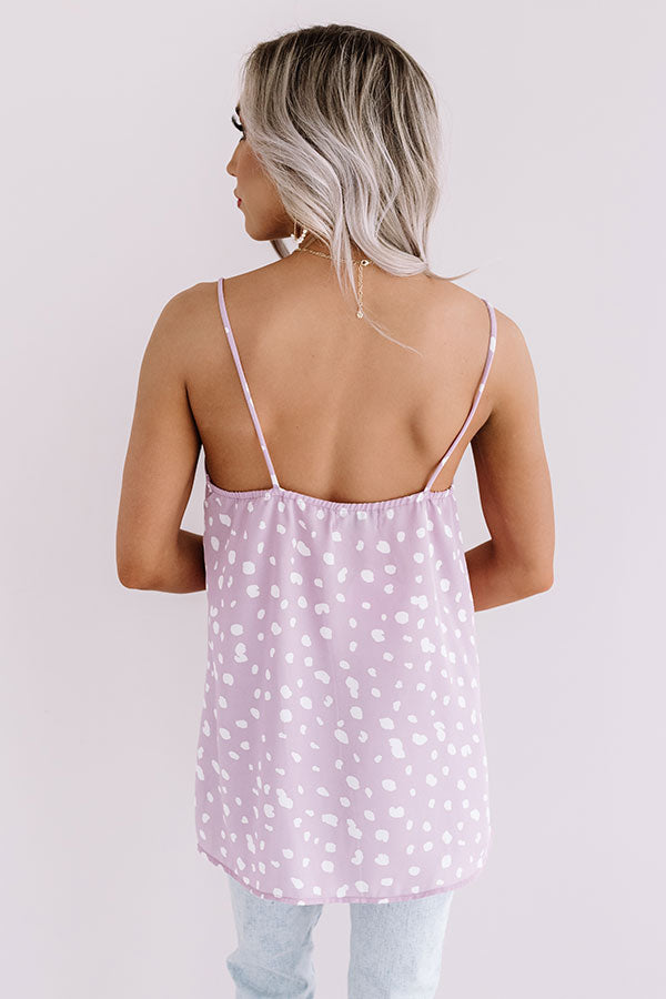 We have no doubt you will love this charming dusty purple colored tank featuring lightweight breezy material patterned with a white leopard print, a straight neckline, spaghetti straps with a low elastic banded back, and a relaxed silhouette that falls into an asymmetrical hemline! You can style this cutie a variety of ways, like with some light wash skinnies and a white heel and statement belt, but you can also wear it layered under a cropped denim jacket with some distressed white shorts, our "Chic Islander Sunnies in Heirloom Lilac," "The Brighton Espadrille in Grey," and "The Essential Faux Leather Backpack in Grey!" Measurements
