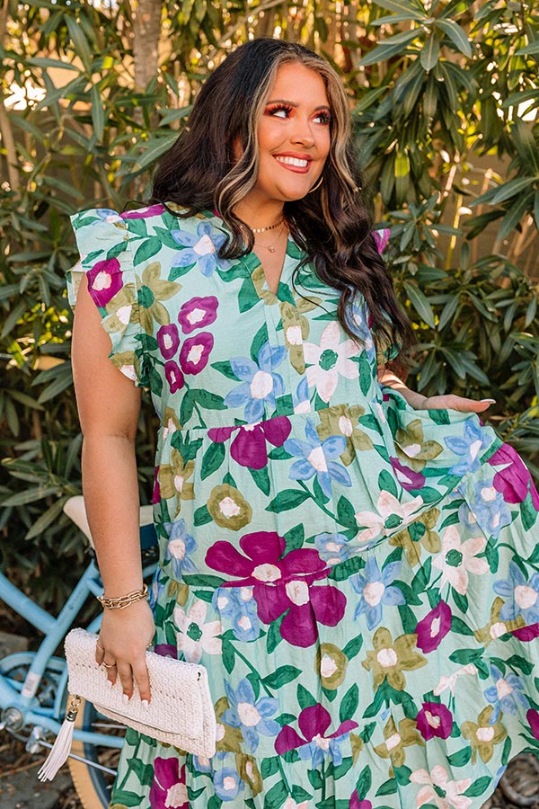 Life's a party, so dress like it in our lively pear hued plus size 'Forever Dreaming' midi dress featuring lightweight material patterned with a bold kelly green, sky blue, orchid, white, and olive hued floral print, a v-cut neckline, ruffled cap sleeves, and a relaxed tiered silhouette that falls into a straight mid-thigh length hemline! Measurements
