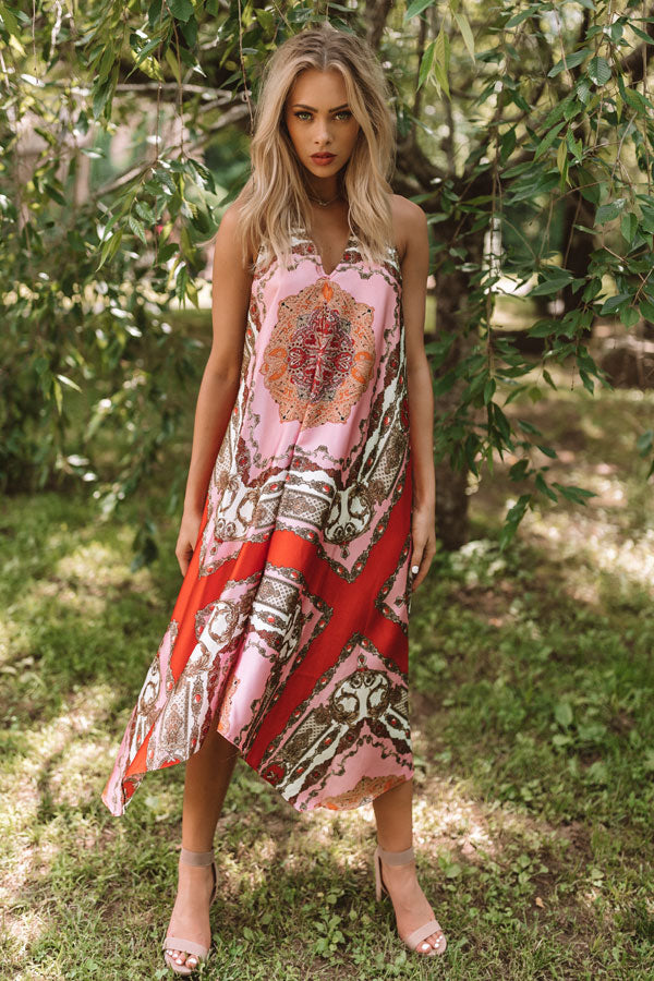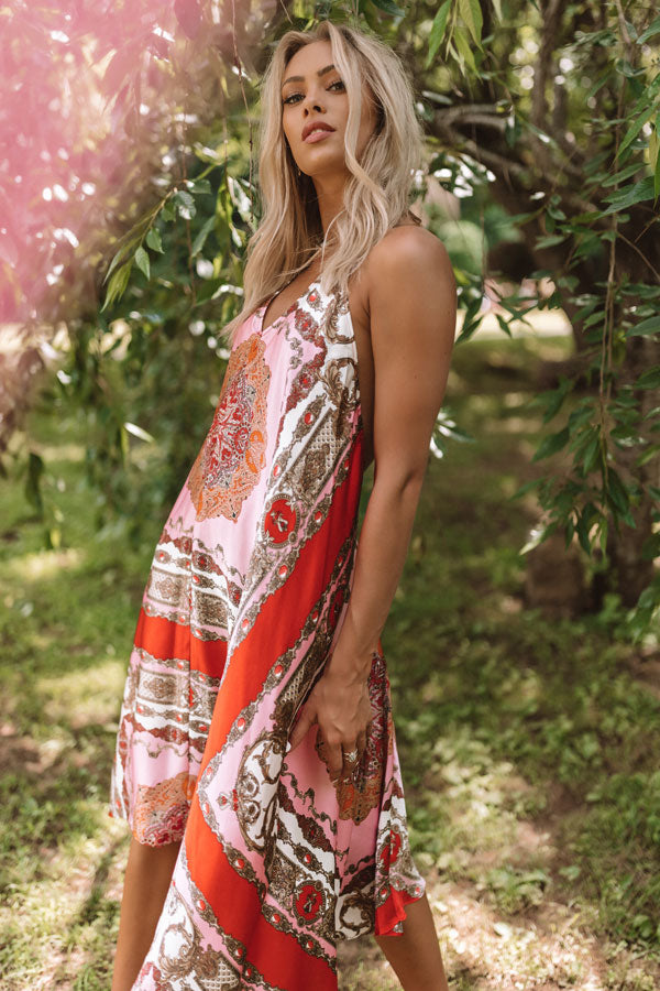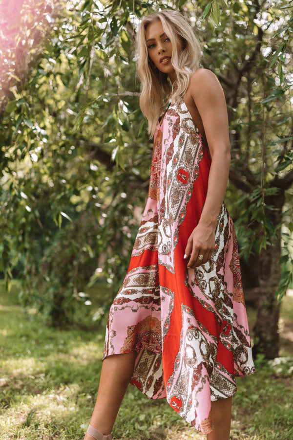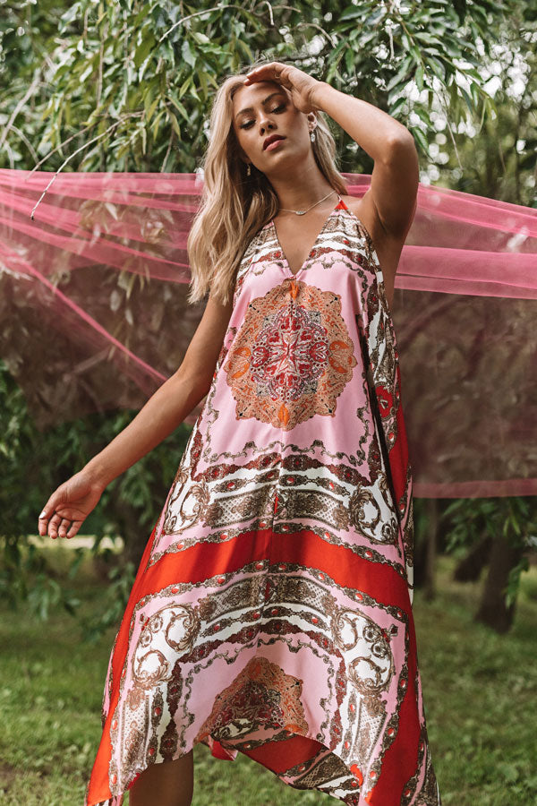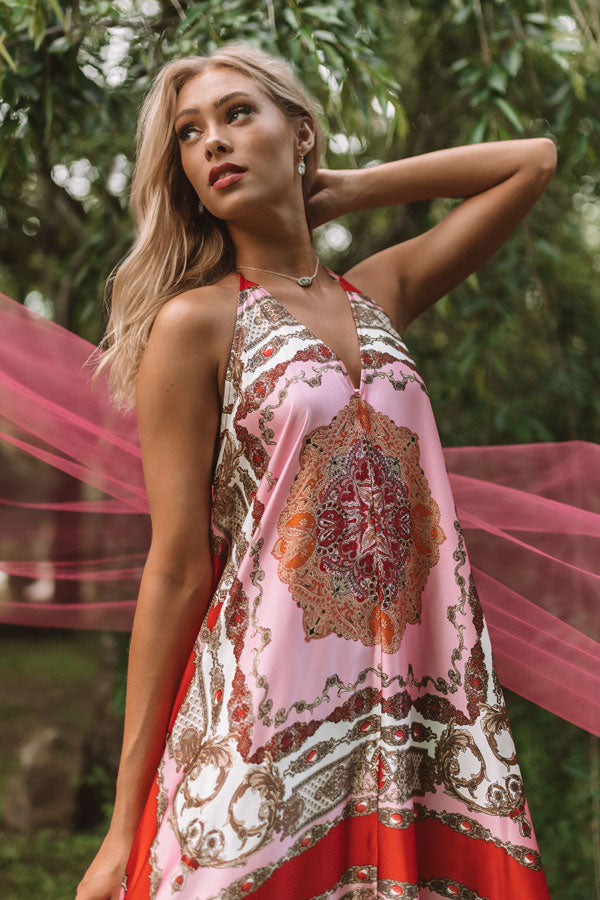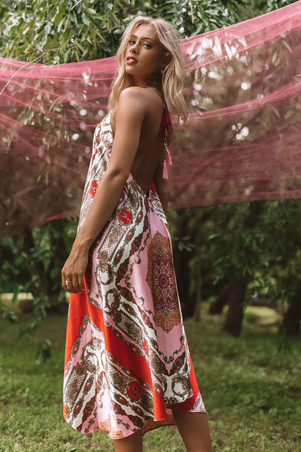 You will be forever fabulous in this halter midi with its silk material, tassel tie back, and Victorian patterns! Style with a neutral heel and some dazzling jewelry for a timeless summer look that will look amazing no matter where you wear it! Measurements