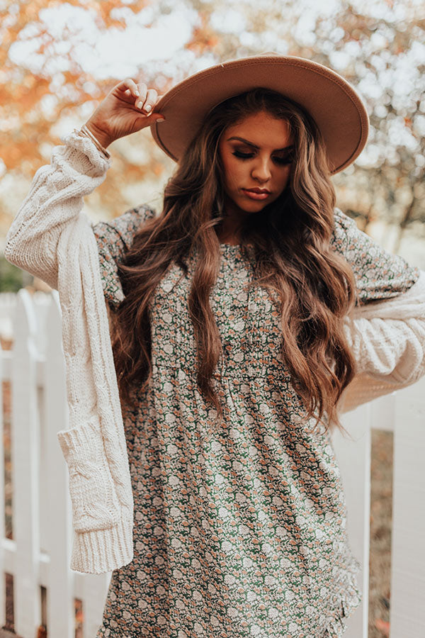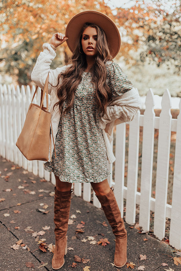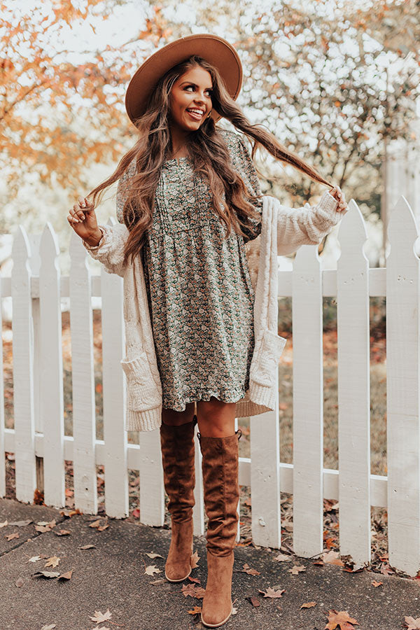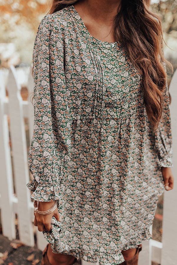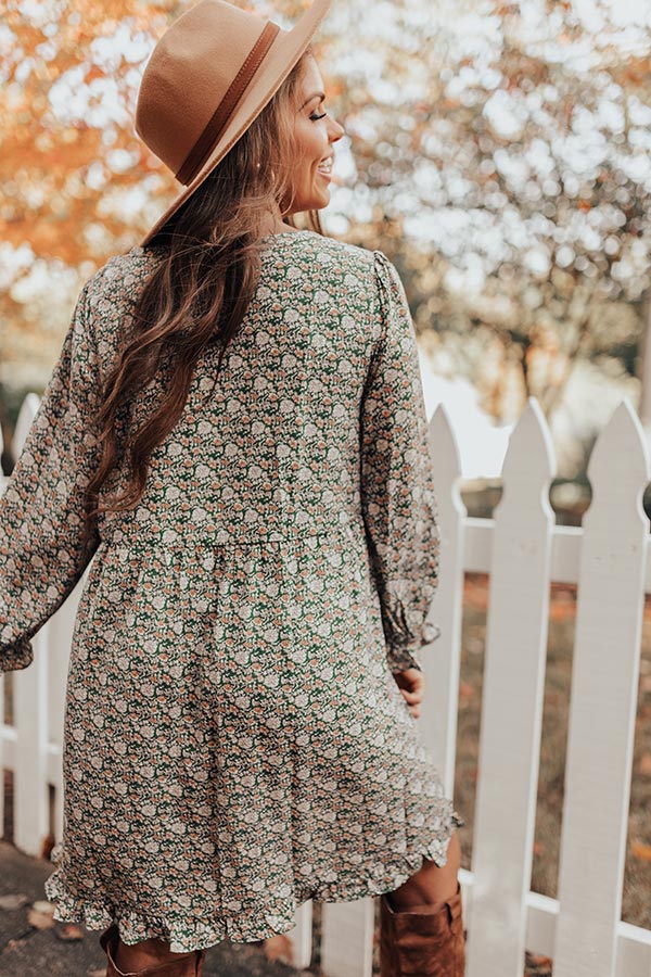 You plus this dress equals a forever kind of love! This olive colored cutie features lightweight flowy material patterned with an intricate floral print, a scooped neckline, a button up bodice with subtle pleats across the bodice, long bubble sleeves with flared cuffs, ruffled trim detailing, and a relaxed silhouette that cascades in to an uneven mid-thigh length hemline! Measurements