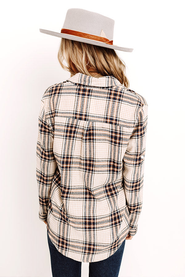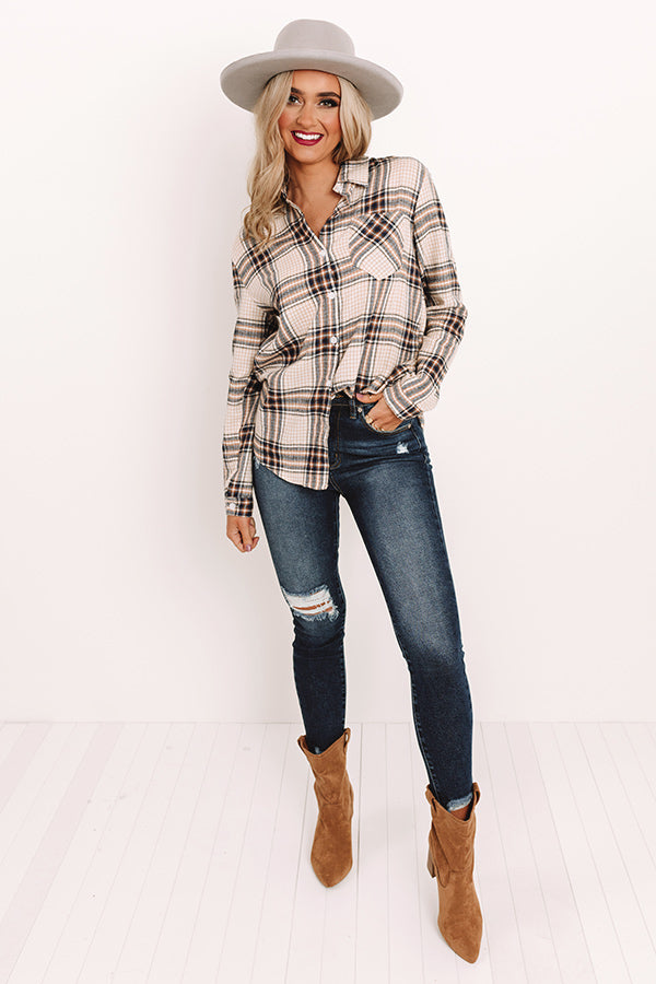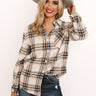 We have no doubt you will want to wear this charming beige colored flannel forever with its soft lightweight material, bold dark plaid print, button down front with a collared neckline, single accent chest pocket, long loose sleeves with fitted button closure cuffs, and slouched silhouette that ends in a rounded hemline! Measurements