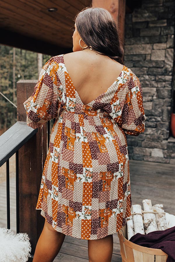 People will forever see you as stylish when you wear this pretty plus size cream hued dress featuring lightweight flowy material patterned with a variety of unique rust, brown, and natural hued floral print patchwork, a v-cut neckline and upper back, bubble half sleeves, and a relaxed silhouette that falls into a straight mid-thigh length hemline!