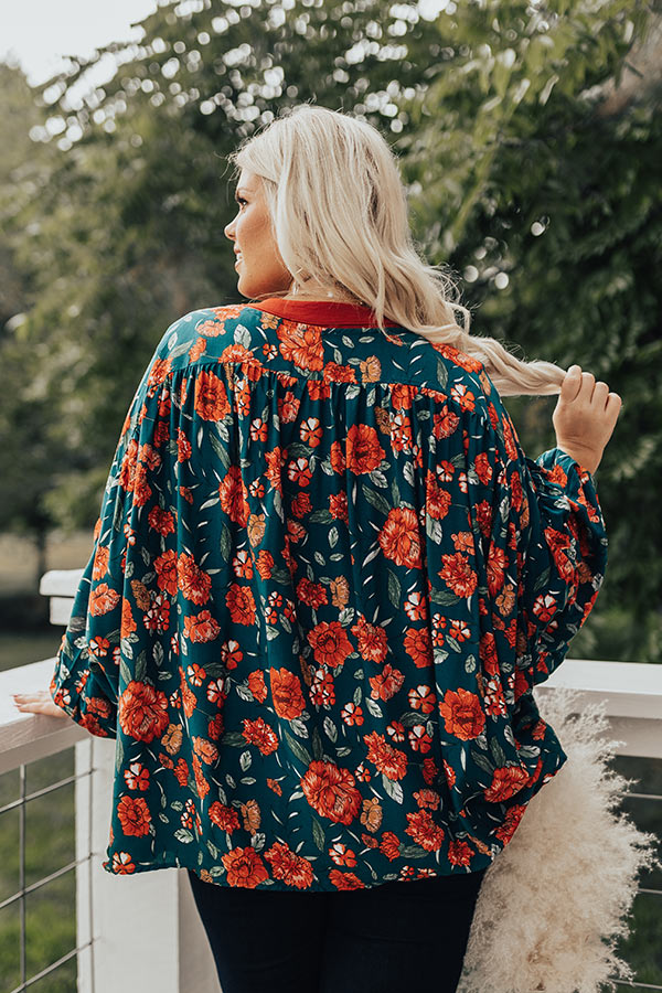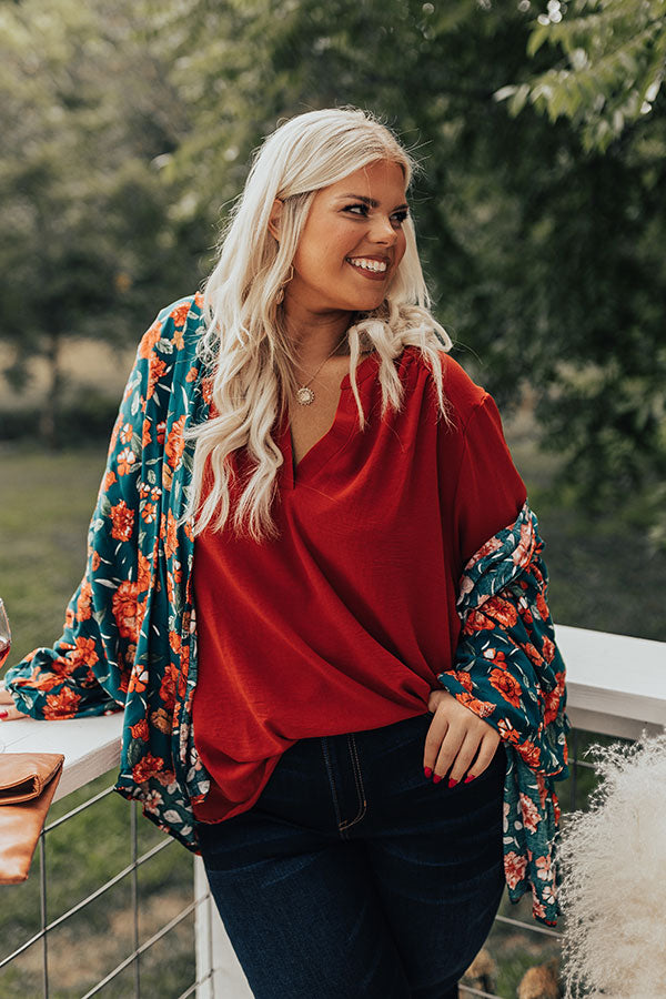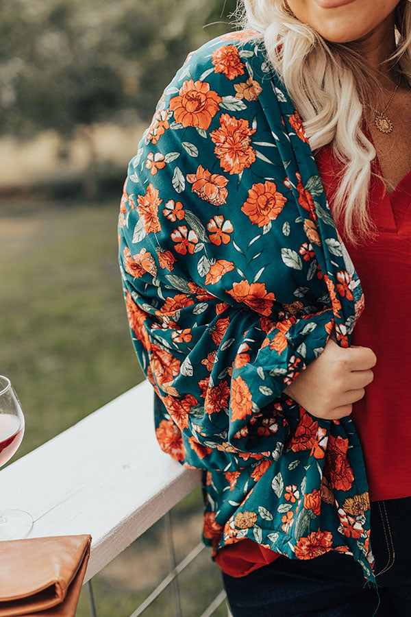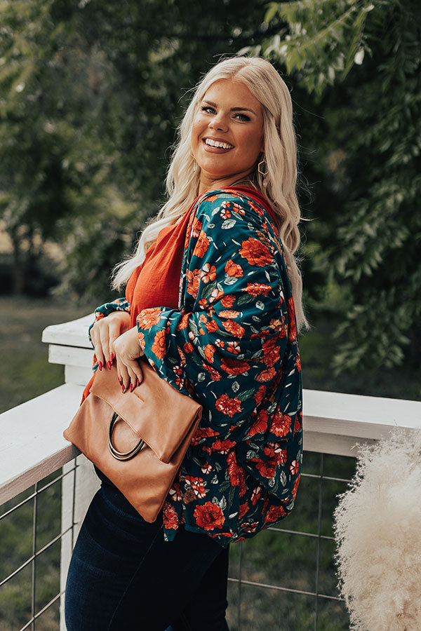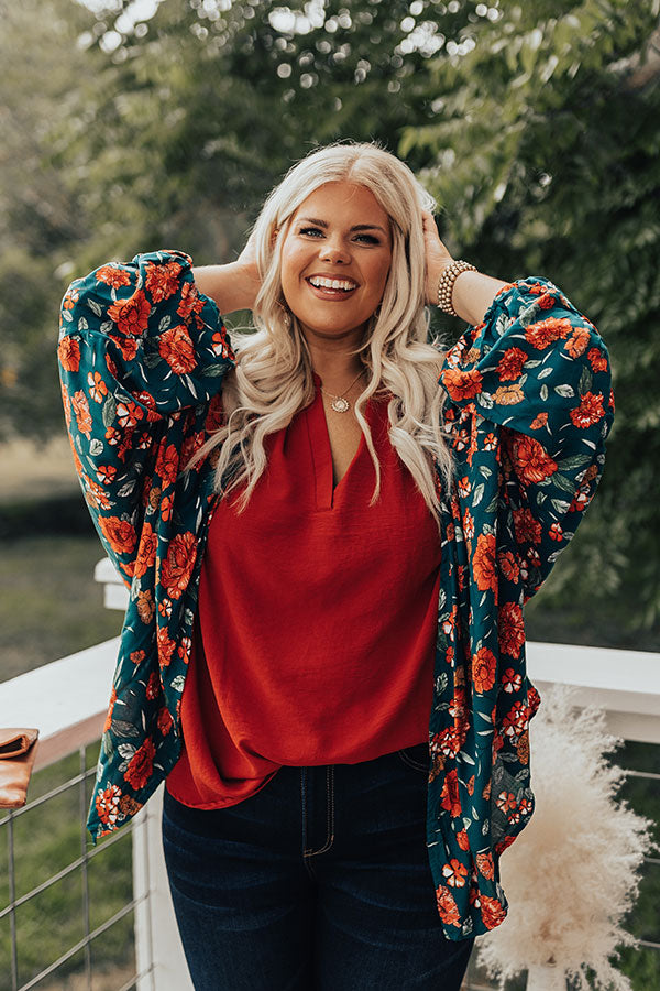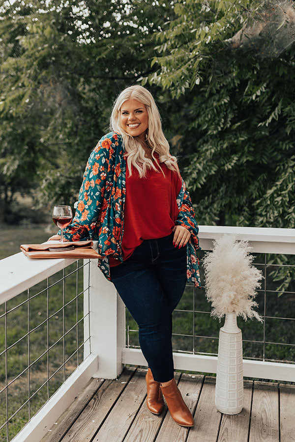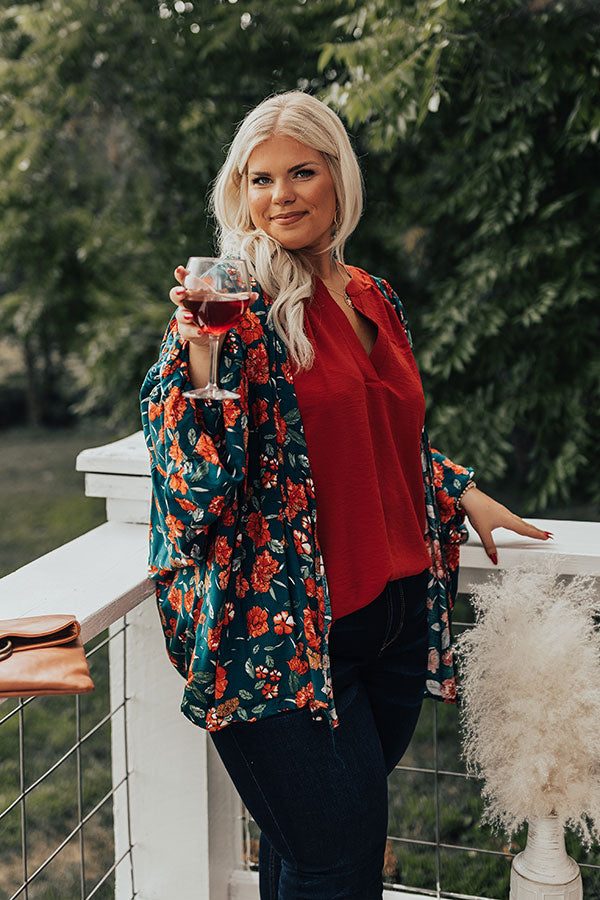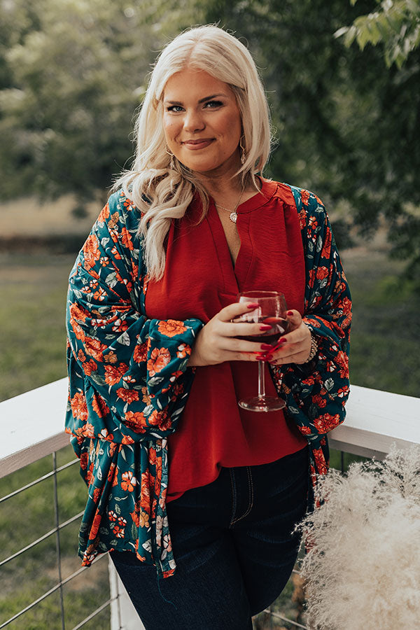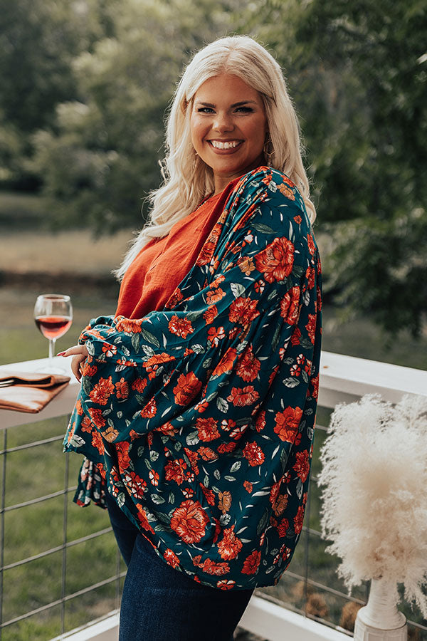 Plus Size - Layer up in style for those chillier fall days with our gorgeous 'Forgotten Love' overlay featuring lightweight flowy material patterned with a dark teal and rust/dark red hued floral print, oversized long sleeves, and a draped open front silhouette that falls into a straight hemline! Measurements