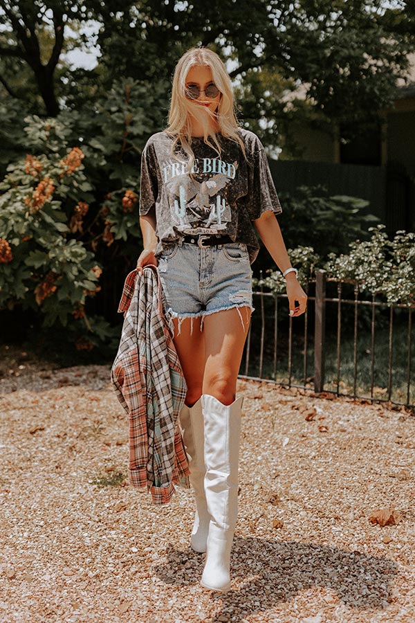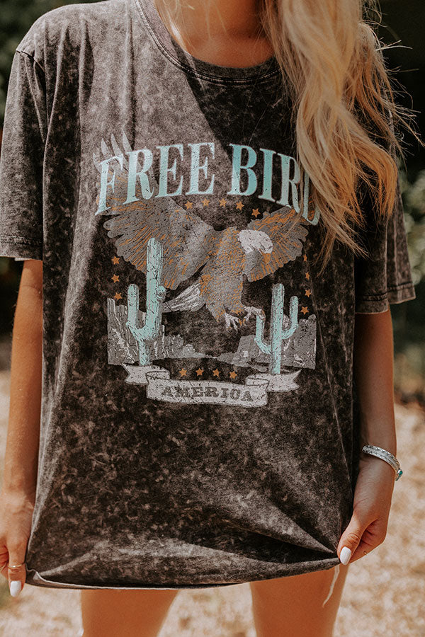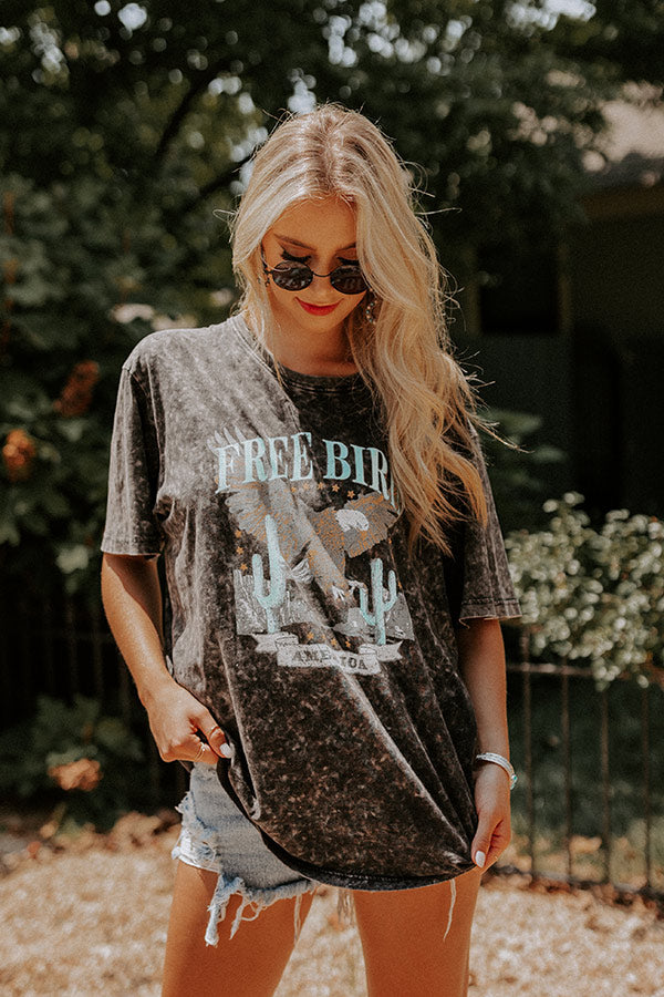 Our vintage black 'Free Bird America' tee features soft mineral wash material with a cute desert graphic on the front, a rounded neckline, loose short sleeves, and a slouched silhouette that ends in a straight hemline!