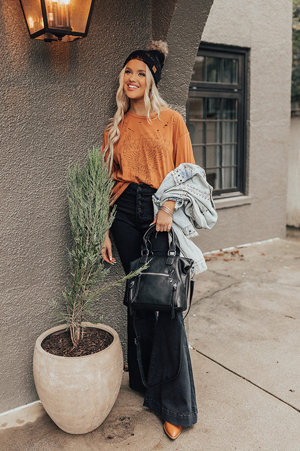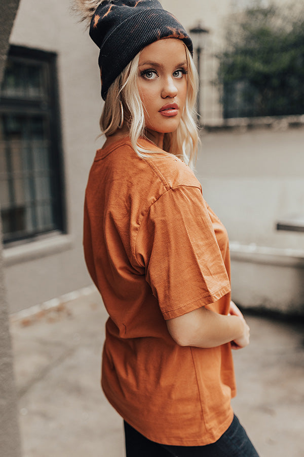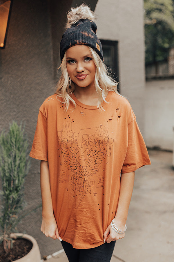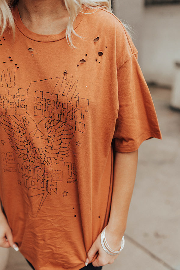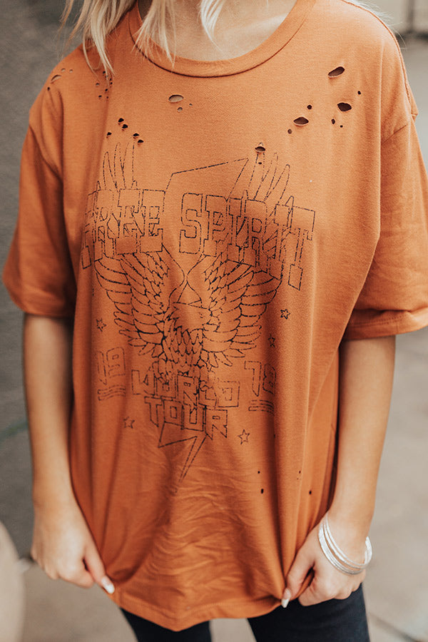 Let your spirit run free in this trendy rust colored tee featuring lightweight cotton blend material with a cute eagle graphic on the front, a rounded neckline with distressed detailing, short loose sleeves, an a relaxed silhouette that ends in a straight hemline! Measurements