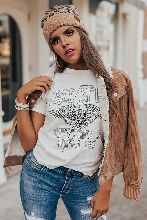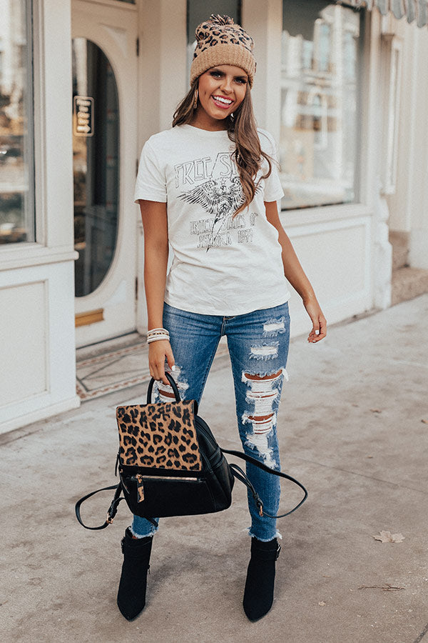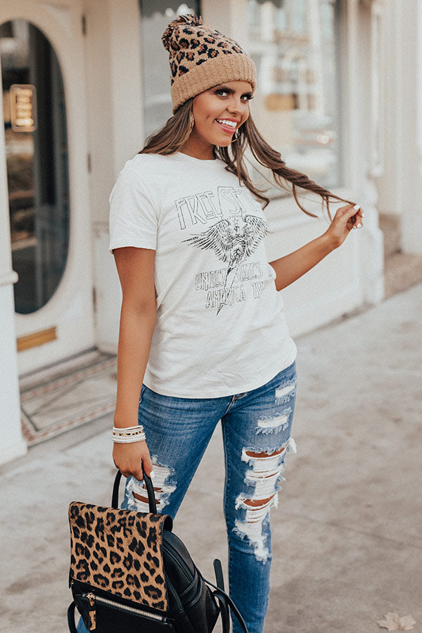 Let your "free spirit" show in this chic ivory colored grunge shift tee featuring soft lightweight t-shirt material, a high rounded neckline, short loose sleeves, a white graphic front, and a relaxed silhouette that falls into a straight hemline! You can style this piece up by layering it under a knit cardigan or corduroy jacket with some distressed ankle skinnies, a leopard beanie, and a black bootie and backpack, but you can also dress if down by wearing it with our "Under The Stars Camo Jogger," our "European Travels Faux Leather Backpack in Black," and "The Skye Sneaker in Black!" Measurements