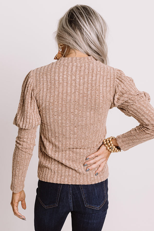 Upgrade your fall basics with our versatile iced latte colored "Free Your Mind" top featuring soft lightweight material with vertical ribbed texturing, a high rounded neckline, long sleeves with puffed shoulders and fitted forearms, and a flattering silhouette that falls into a straight hemline! Measurements