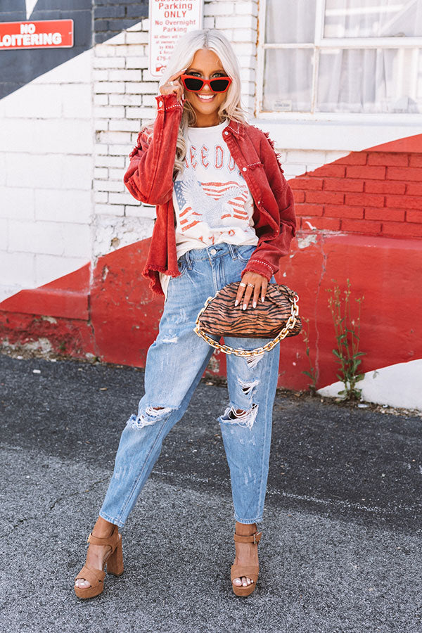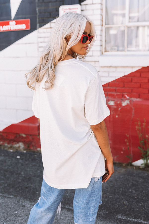 Our white 'Freedom 1776' tee features soft lightweight material with a cute American flag and eagle graphic on the front, a rounded neckline, loose short sleeves, and an oversized silhouette that ends in a straight hemline!