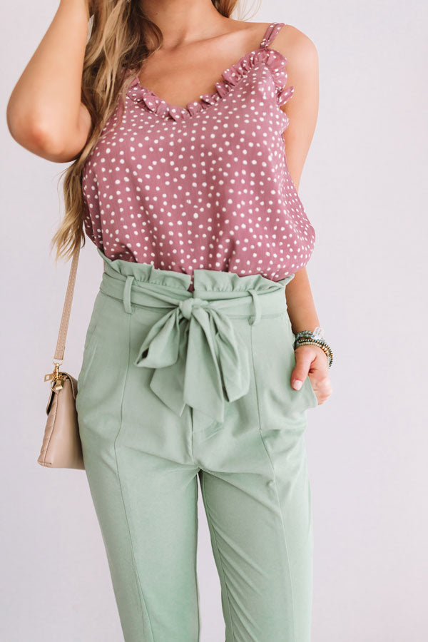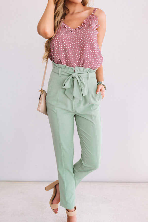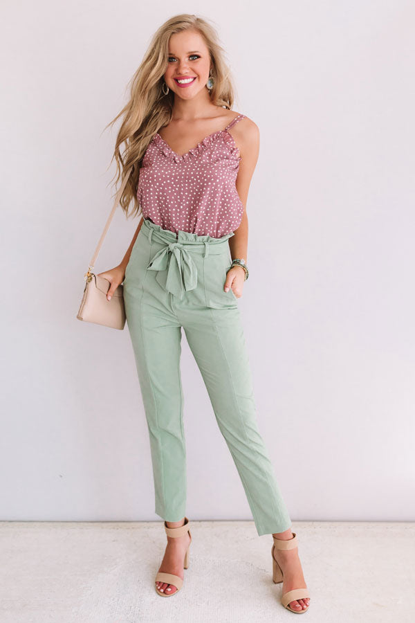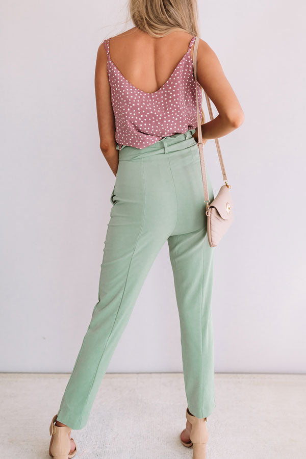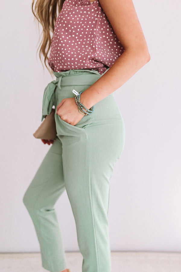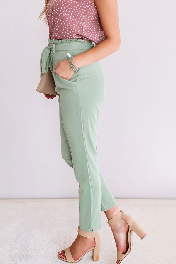 Conquer your work week in these sassy light sage trouser pants! These chic high waisted dress pants have a ruffled waistline with coordinating tie belt, hidden side pockets and a tapered leg with a single-split hem! Included is a hidden zip fly and a hook and button closure.