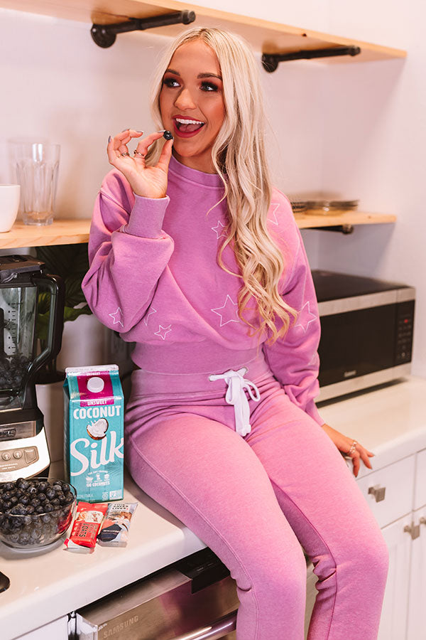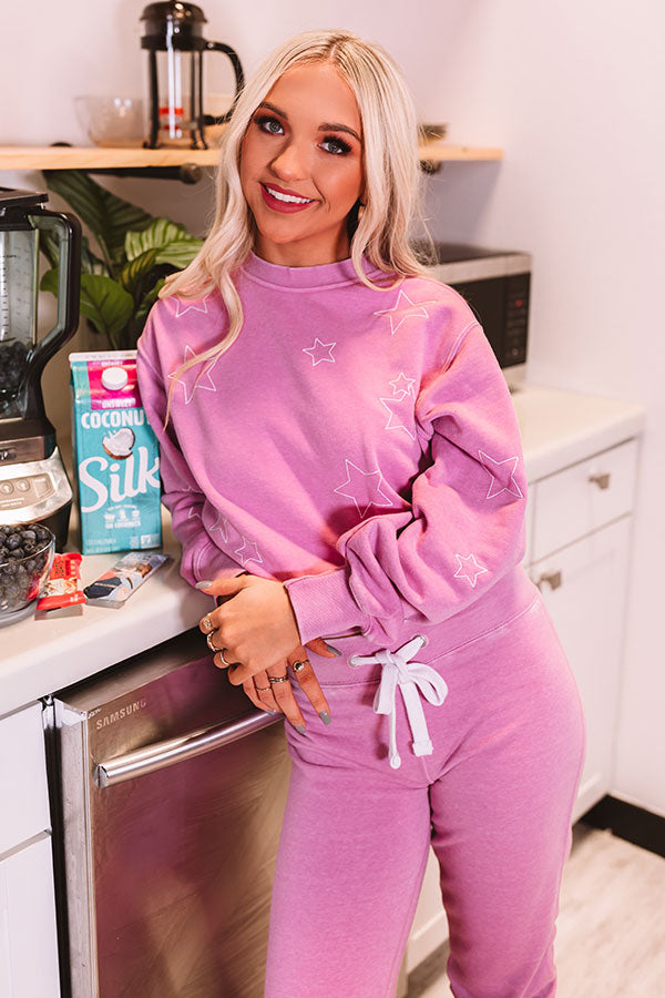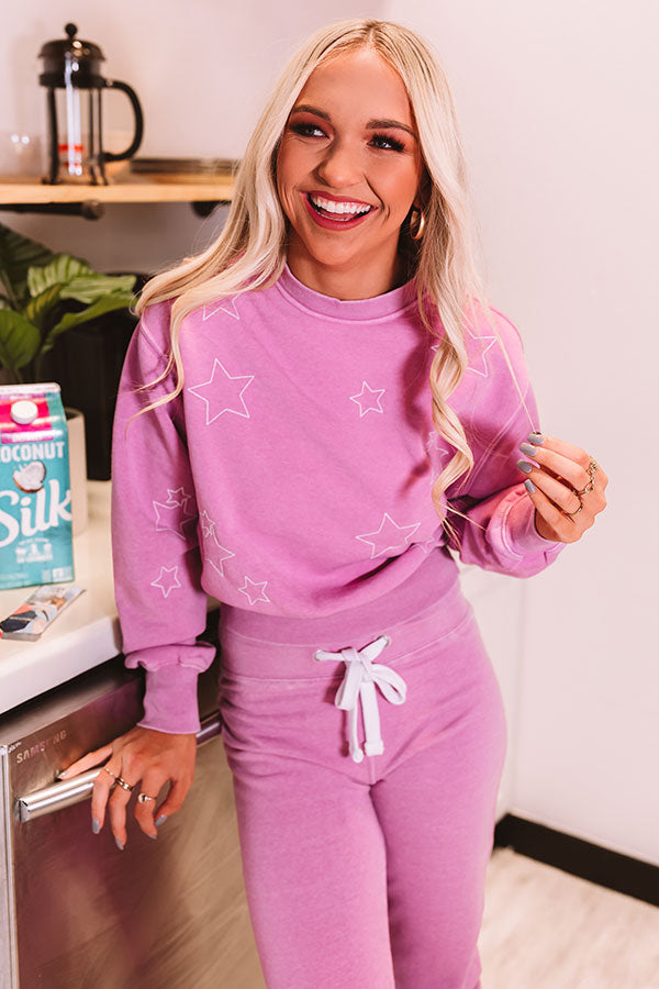 Give your winter wardrobe a breath of fresh air with this casual cute violet colored sweatshirt featuring soft lightweight material patterned with subtle embroidered stars, a high rounded neckline, long loose sleeves with fitted cuffs, and a slouched silhouette that ends in a wide straight hemline!