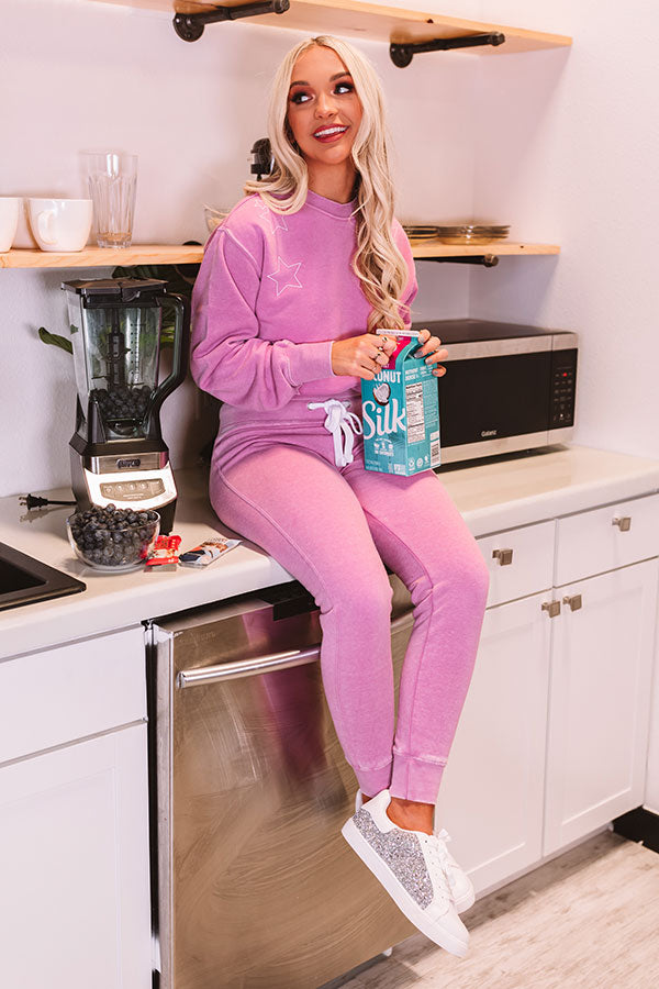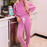 Give your winter wardrobe a breath of fresh air with these casual cute violet colored joggers featuring soft lightweight, a wide elastic waistline with a tie belt, two accent back pockets, and a slouched pants silhouette that tapers into fitted ankle-length hemlines! Measurements
