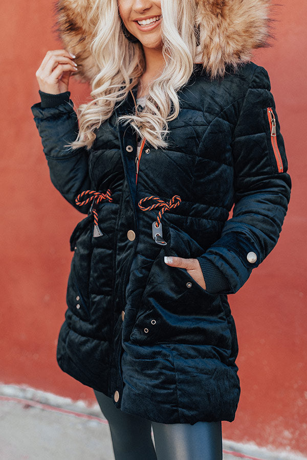 There is no better way to stay warm and protected from the chilly "fresh snowfall" than with this adorable black coat featuring thick material with quilted texturing, ultra soft faux fur lining, long lose sleeves with fitted button closure cuffs and accent upper arm zipper pockets, a cinched elastic waistband, low hidden side pockets, a hooded back, and a relaxed silhouette that falls into a straight tunic length hemline! You can wear this trendy piece with a camisole, bodysuit, or summer dress underneath or you can put it over a fall blouse to add some edginess to your pristine transitional style!