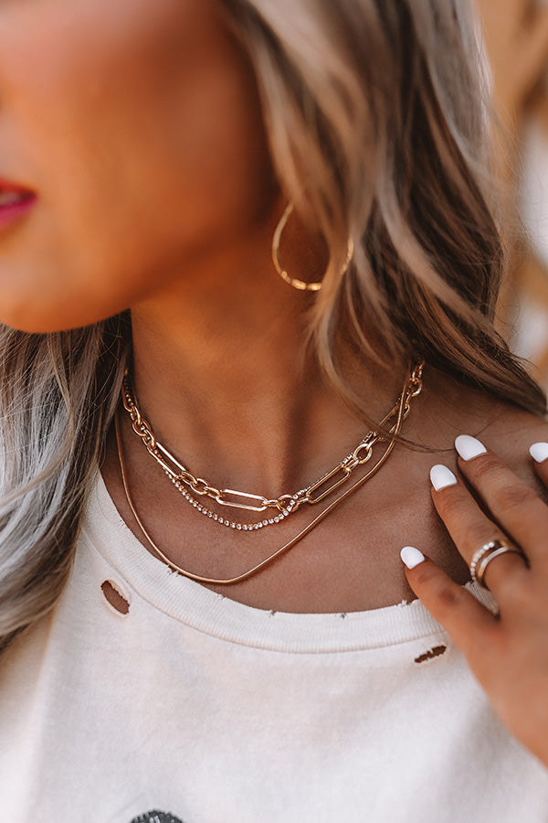 Add a fresh take to your jewelry style with this luxe gold necklace featuring three layered pieces: a large link choker, a medium length small ball chain, and a longer snake chain!