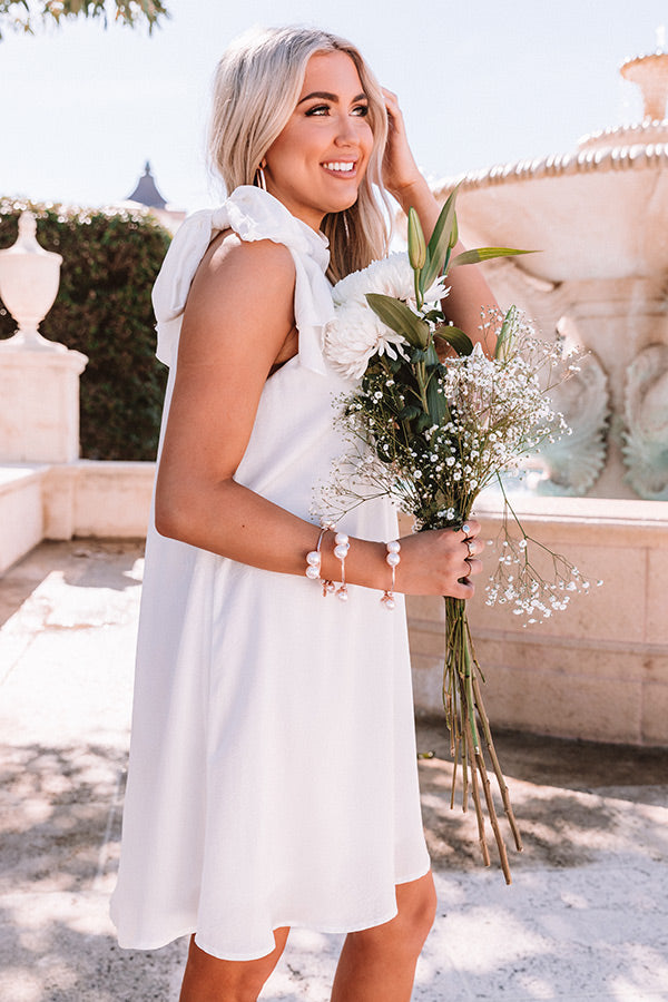 Get glamorous on a Friday night with this charming white shift dress featuring lightweight flowy material, a tie closure halter neckline, a flattering sleeveless fit, and a relaxed silhouette that falls into a straight mid-thigh length hemline! Measurements