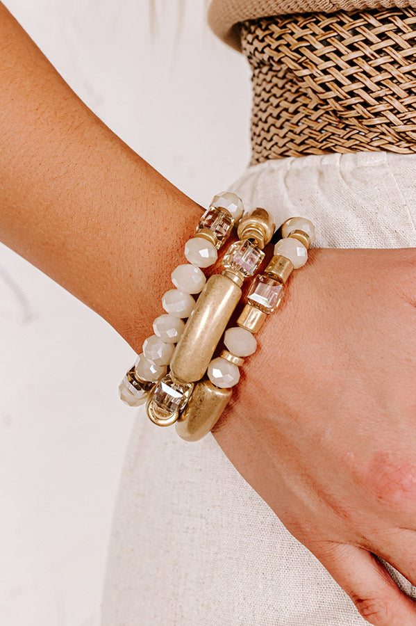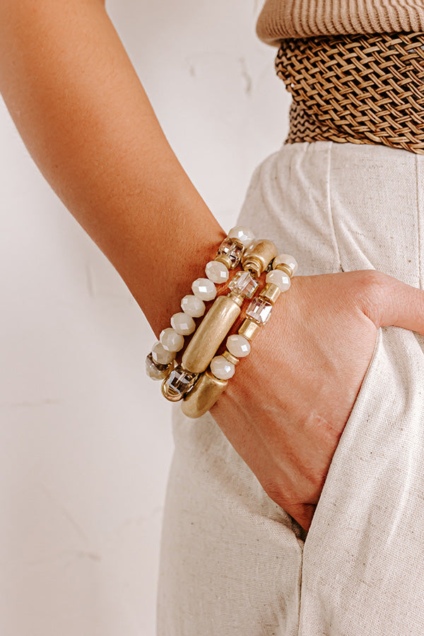 - A set of 3 stretchy bracelets with shimmering clear and champagne colored beads with gold toned accent beads