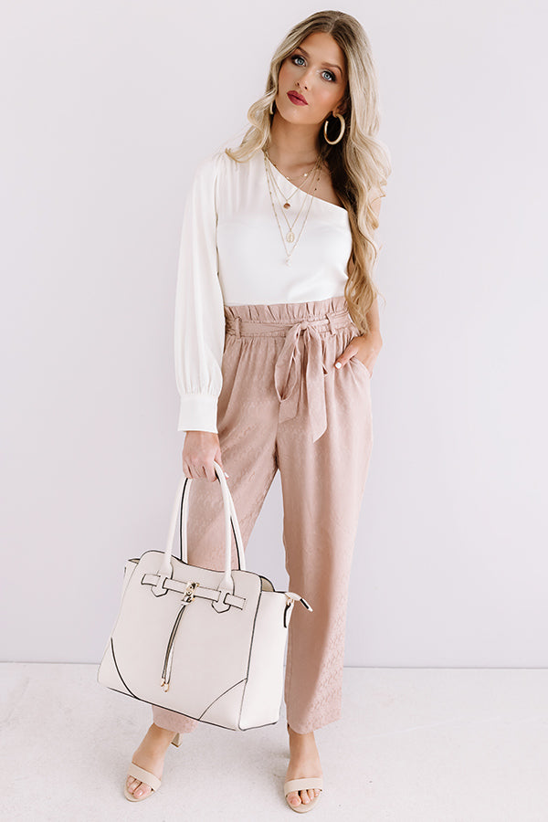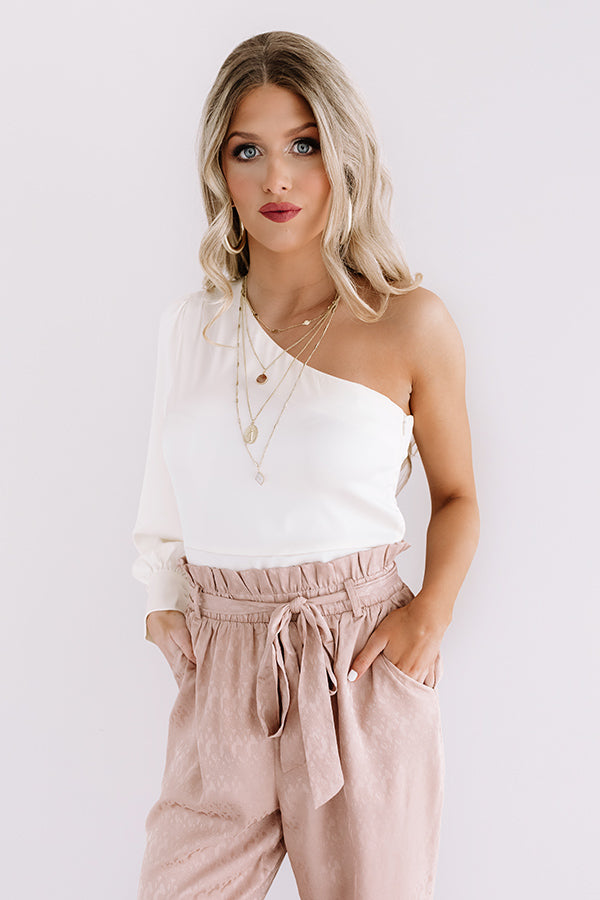 You are sure to make the "front page news" when you wear this chic cream colored top featuring lightweight satin material, a single long bubble sleeves with a fitted button closure cuff and an open shoulder fit, and a form fitting bodice that falls into a peplum bottom with a slanted hemline! We have styled this elegant piece with some trousers, neutral heels, and a matching tote, but you can also wear it dressed down with some distressed ankle skinnies, our "Chic Soleil Headband," and our "Five Star Jute Wedge in Hot Pink!" Measurements