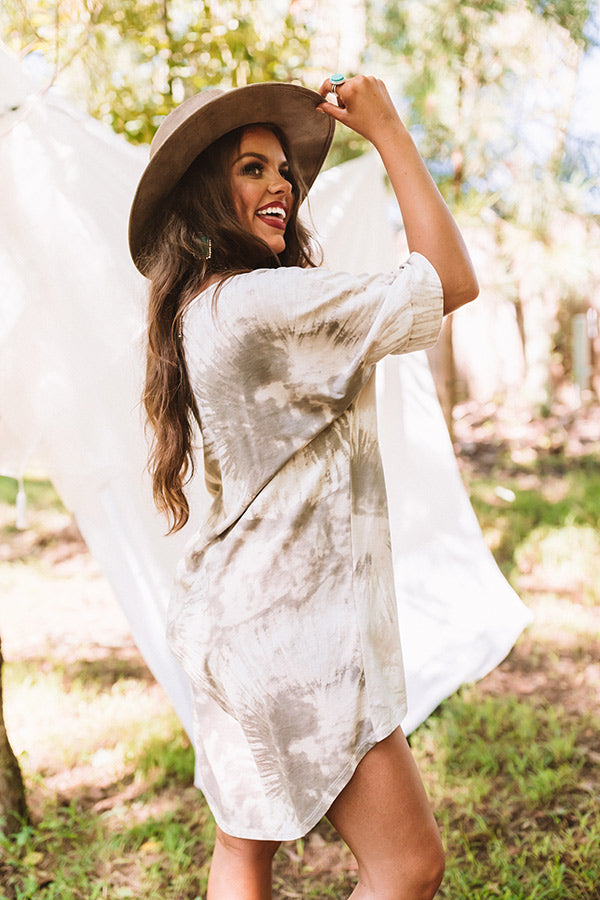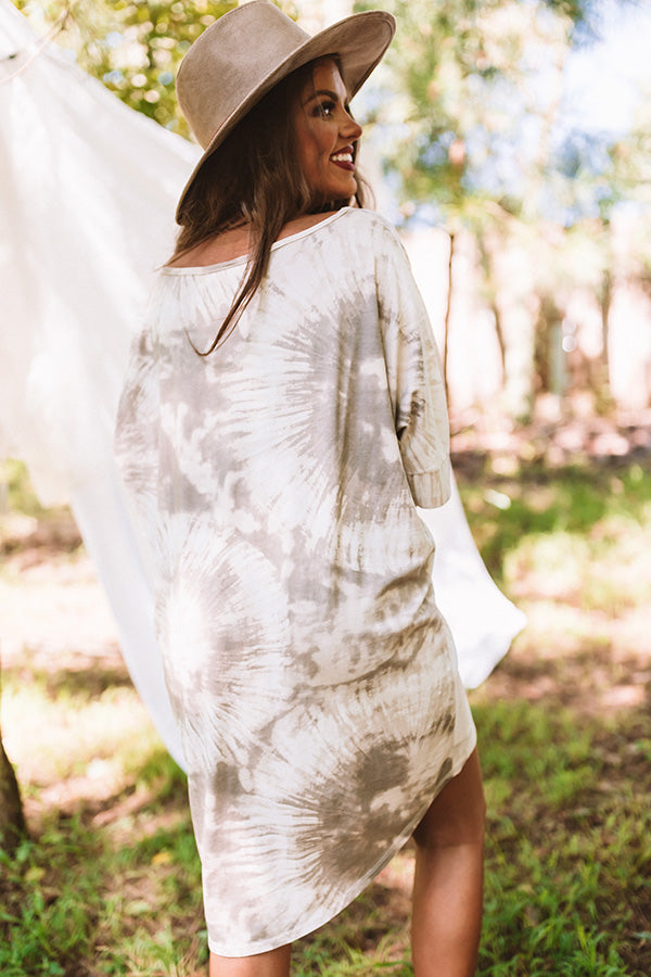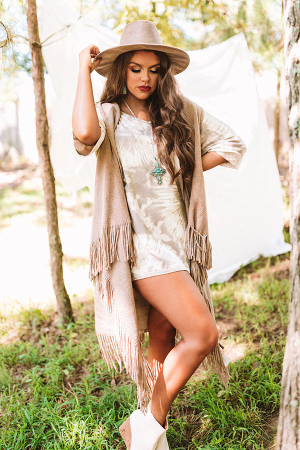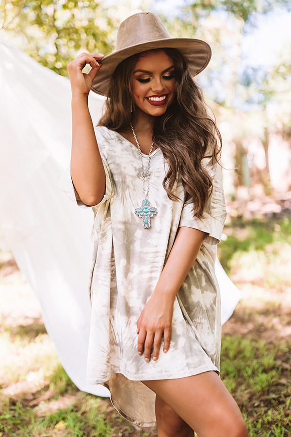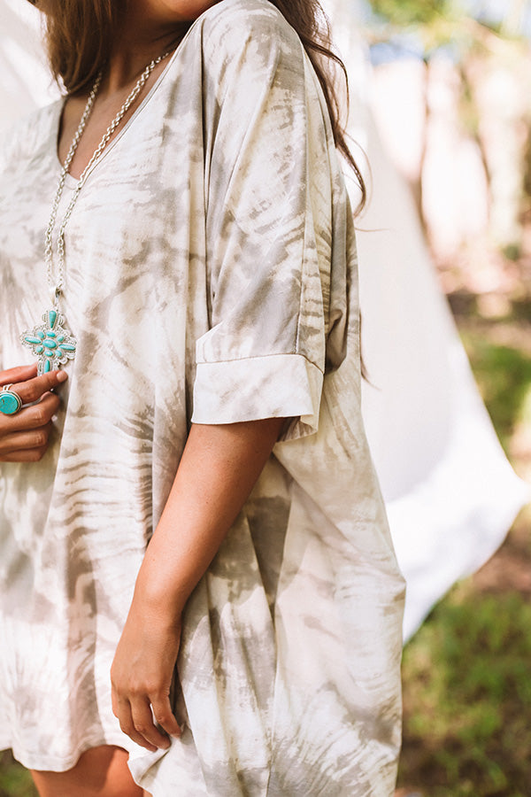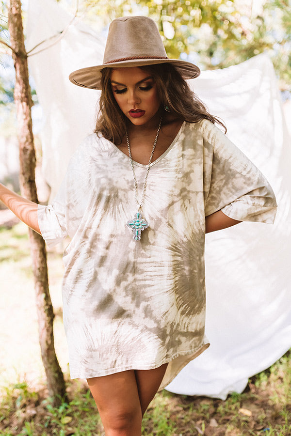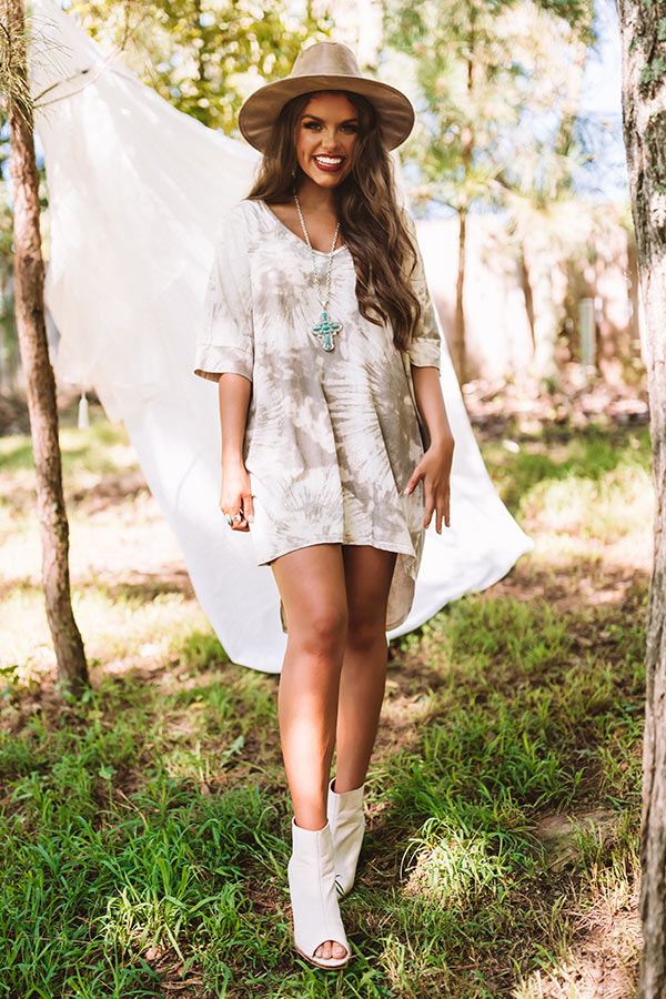 Swing into fall in style with this adorable tunic featuring soft lightweight material patterned with taupe colored tie dye, a wide v-cut neckline, short loose sleeves with wide cuffs, and a relaxed silhouette that falls into a rounded mid-thigh length hemline! We have styled this cutie as a dress and layered it under a fringe vest with a matching wedged bootie and wool hat, but you can also wear it front tucked into some distressed jean shorts, "The Brighton Espadrille in Taupe," and our "Sense Of Style Woven Bag in Stone!"